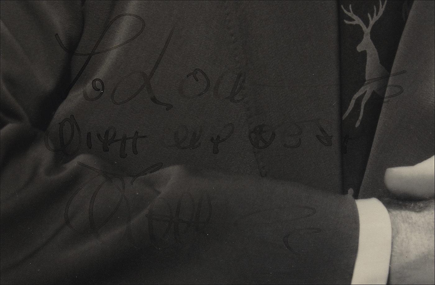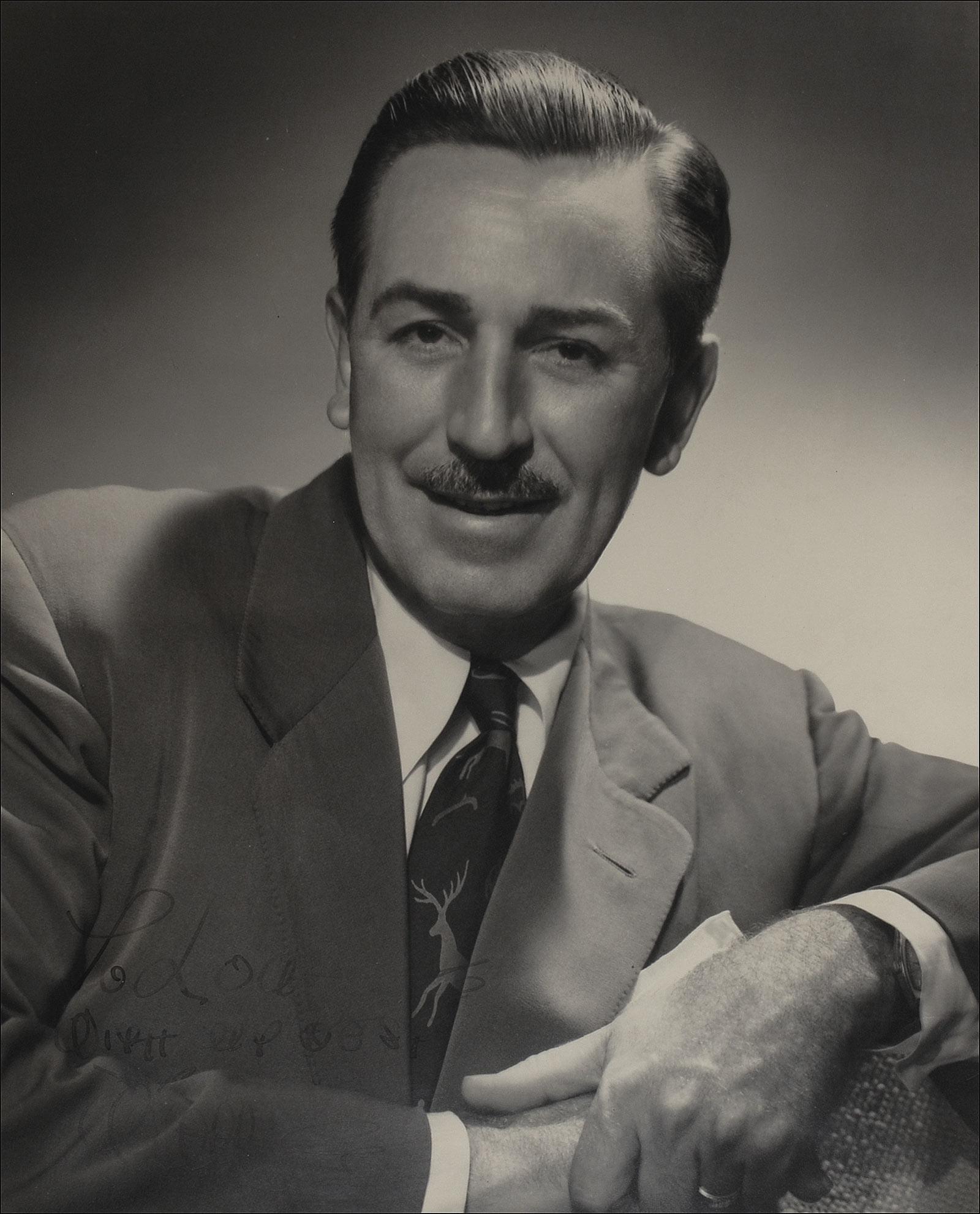 Oversized vintage matte-finish 13 x 16 photo of Disney casually leaning on a chair, signed and inscribed in fountain pen “To Lou—With my best, Walt.” Double matted and framed to an overall size of 20.5 x 23.5. Signature and inscription fairly light, but mostly legible, and some light creasing to background of top right, otherwise fine condition. Pre-certified PSA/DNA and RRAuction COA.