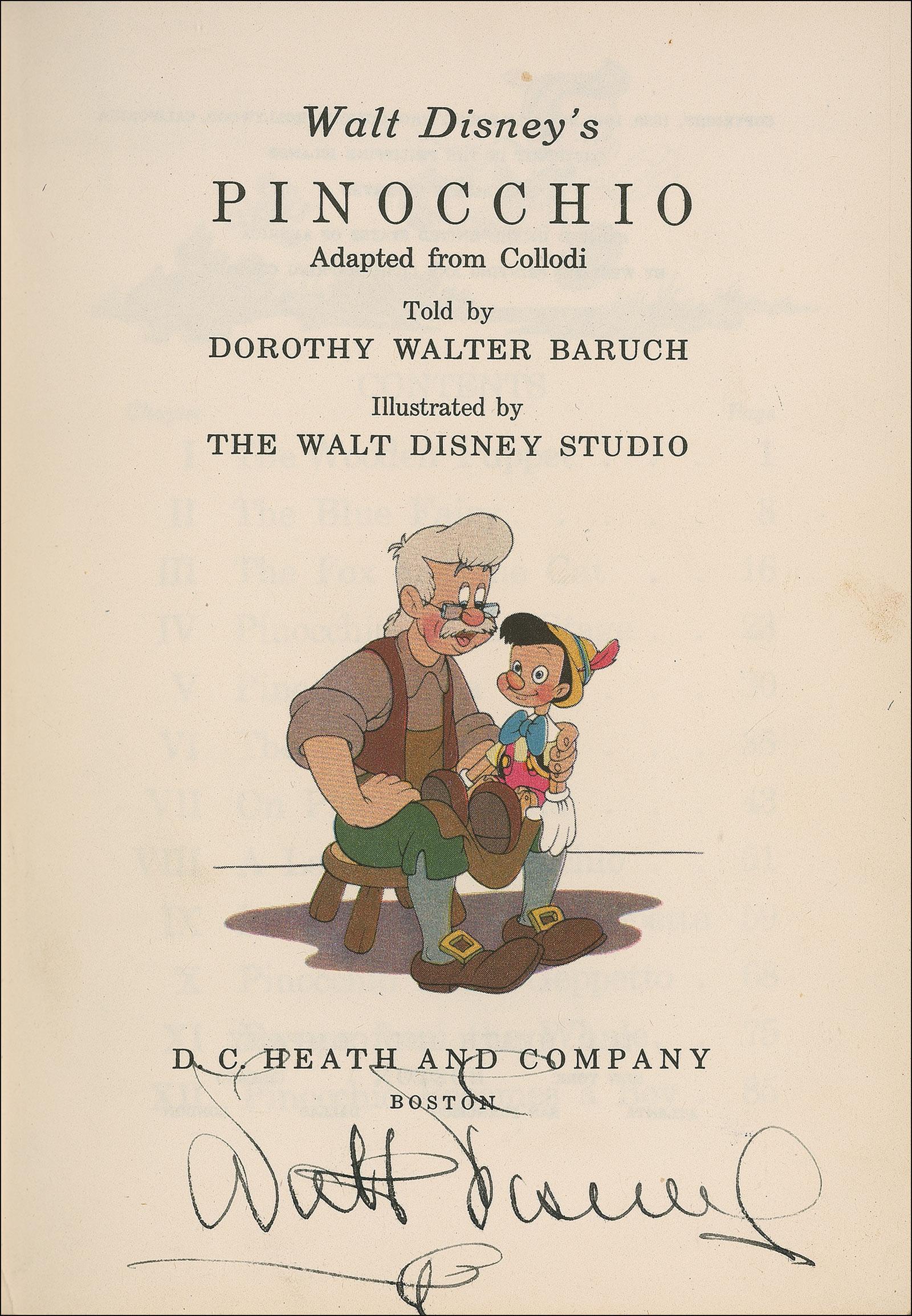 Signed book: Pinocchio. Later printing. Boston: D. C. Heath, 1940. Hardcover, 6.25 x 8.5, 90 pages. Signed in fountain pen at the bottom of the title page, “Walt Disney.” In very good condition, with a bit of light staining to fore-edges, light sunning and foxing to spine, and some surface wear, moderate scuffing, and color loss to both covers. Accompanied by a letter from the Walt Disney Archives offering a positive opinion on the authenticity of the signature.