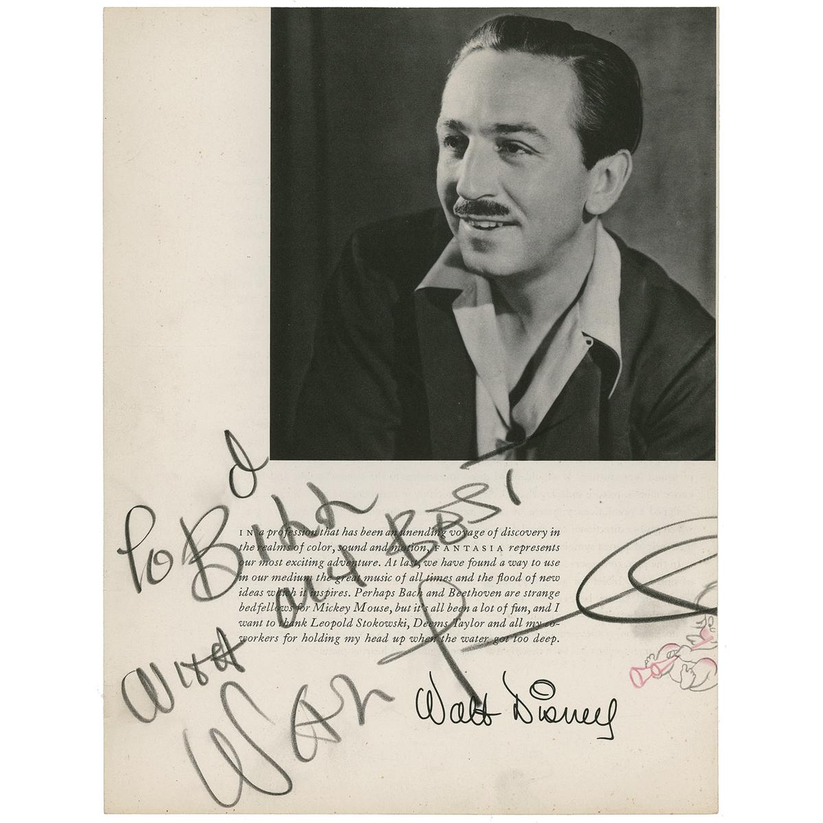 Vintage Fantasia program page, trimmed to a size of 8 x 10.5, featuring an image of Disney and a pre-printed message of thanks to Leopold Stokowski, Deems Taylor, and all his co-workers, signed and inscribed in black crayon, “To Bill, with my best, Walt.” In fine condition, with a horizontal fold, not affecting signature, and a bit of scattered light soiling. Accompanied by a certificate of authenticity from Disney expert Phil Sears.