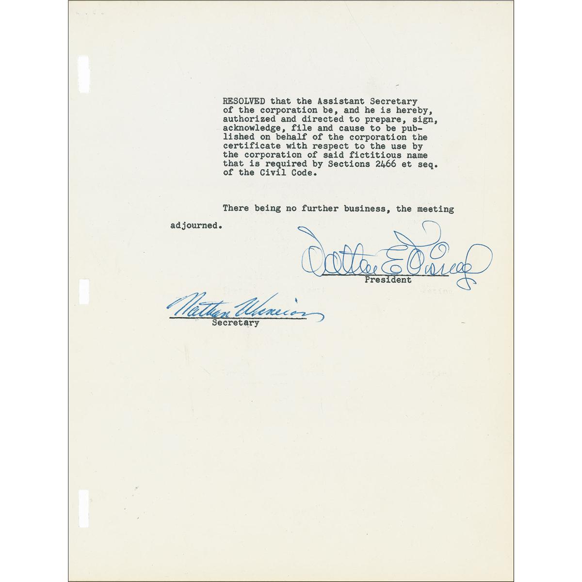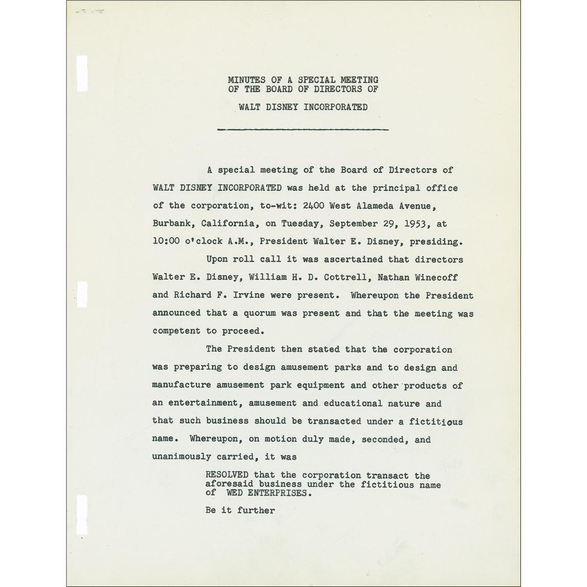 DS, signed “Walter E. Disney,” two pages, 8.5 x 11, September 29, 1953. Minutes from a special meeting of the Board of Directors of Walt Disney Incorporated. Document reads, in part: “The President then stated that the corporation was preparing to design amusement parks and to design and manufacture amusement park equipment and other products as entertainment, amusement, and educational nature and that such business should be transacted under a fictitious name. Whereupon, on motion duly made, seconded, and unanimously carries, it was RESOLVED that the corporation transact the aforesaid business under the fictitious name of WED Enterprises. Be it further RESOLVED that the Assistant Secretary of the corporation be, and he is hereby, authorized and directed to prepare, sign, acknowledge, file and cause to be published on behalf of the corporation the certificate with respect to the use by the corporation of said fictitious name.” In fine, clean condition, with file holes to left edges, staple hole to top left corner, and a hint of subtle toning.