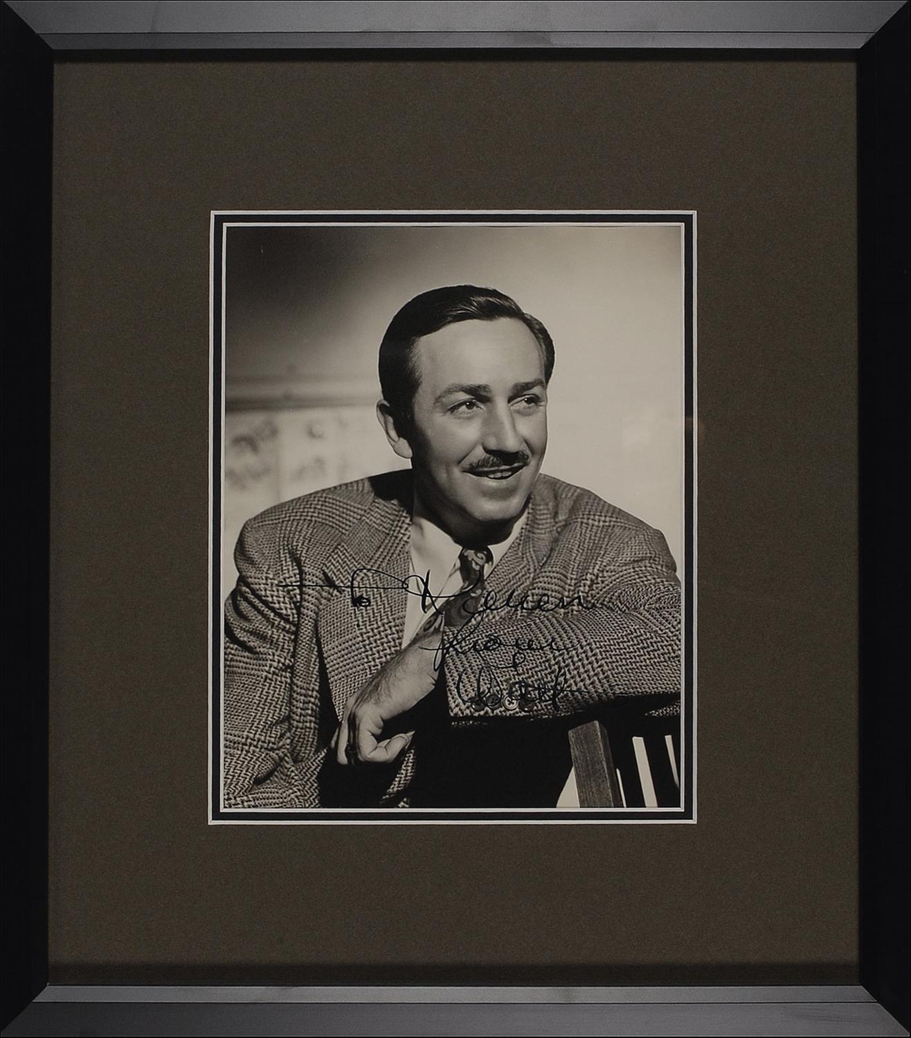 Exceptional vintage matte-finish 7.25 x 9.25 photo of Disney resting his arm on a chair, signed and inscribed in fountain pen “To Karen from Walt.” Double matted and framed to an overall size of 14.5 x 16.5. In fine condition. A photo of exceptional quality and condition.