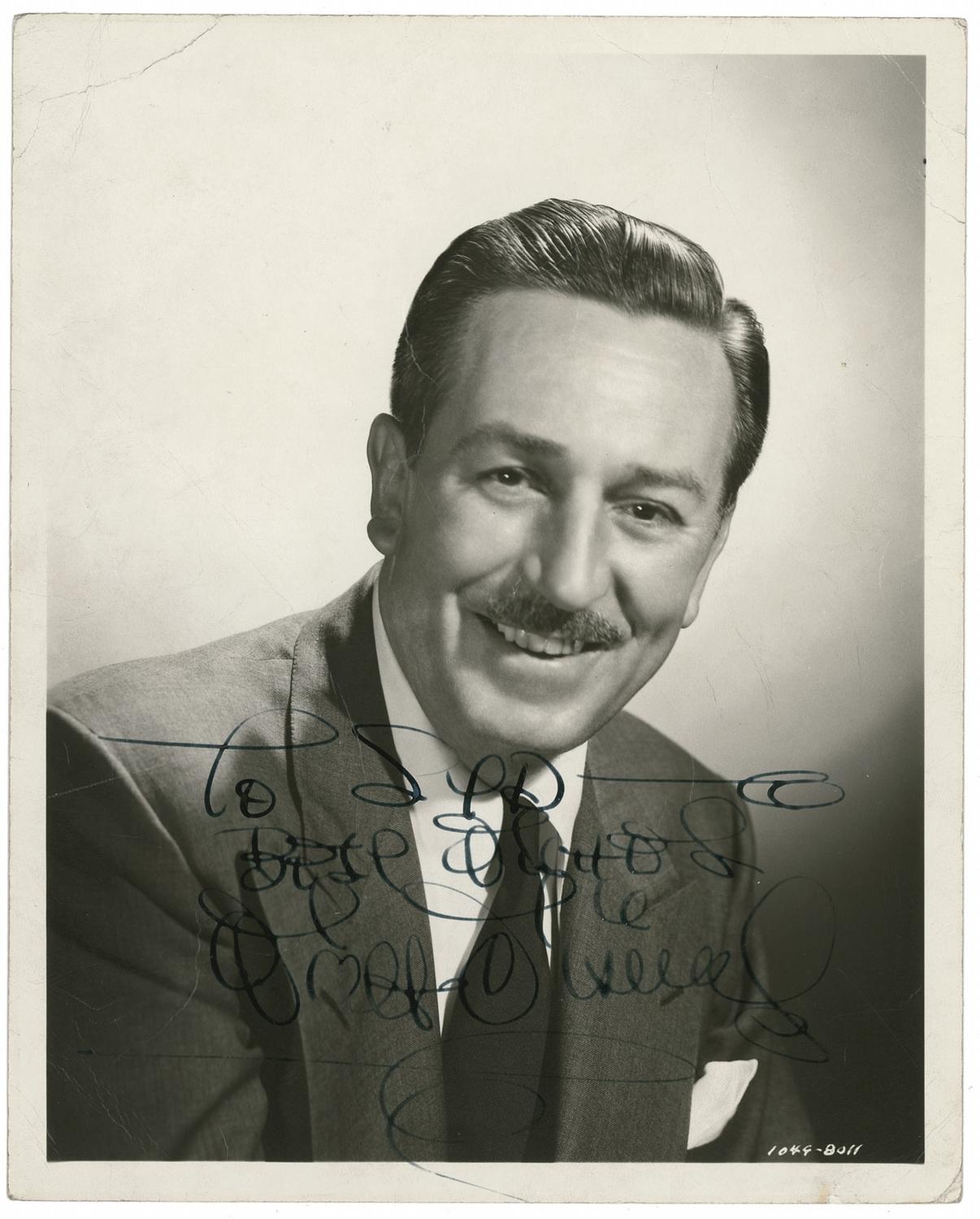 Vintage matte-finish 8 x 10 head-and-shoulders portrait, signed and inscribed in fountain pen “To Syd, Best wishes, Walt Disney.” A bit of light skipping to beginning portion of Disney’s signature, and moderate overall creasing to image and background, otherwise very good condition.