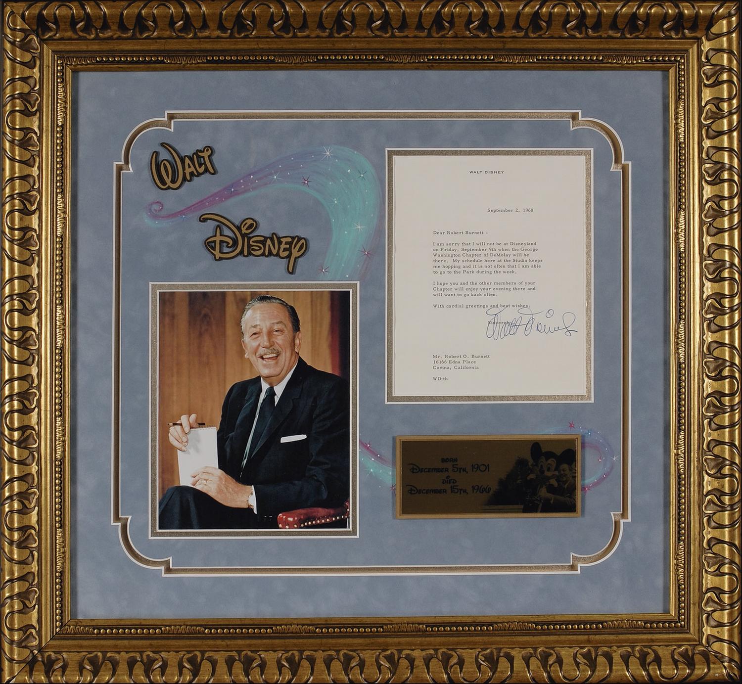 TLS, one page, 6.5 x 8.25, personal letterhead, September 2, 1960. Letter to a gentleman in Covena, California. In full: “I am sorry that I will not be at Disneyland on Friday, September 9th when the George Washington Chapter of DeMolay will be there. My schedule here at the Studio keeps me hopping and it is not too often that I am able to go to the Park during the week. I hope that you and the other members of your Chapter will enjoy your evening there and will want to go back often.” Double suede matted and framed, with pastel highlights to mat, with a color photo of Disney and a small plaque, to an overall size of 25 x 23.25. In fine condition. Disney himself was a DeMolay alumni. Initiated into Mother Chapter in Kansas City, Missouri, in 1920, he received the Legion of Honor in 1931. Disney was a member of the first class to be inducted into the DeMolay Hall of Fame on November 13, 1986.
