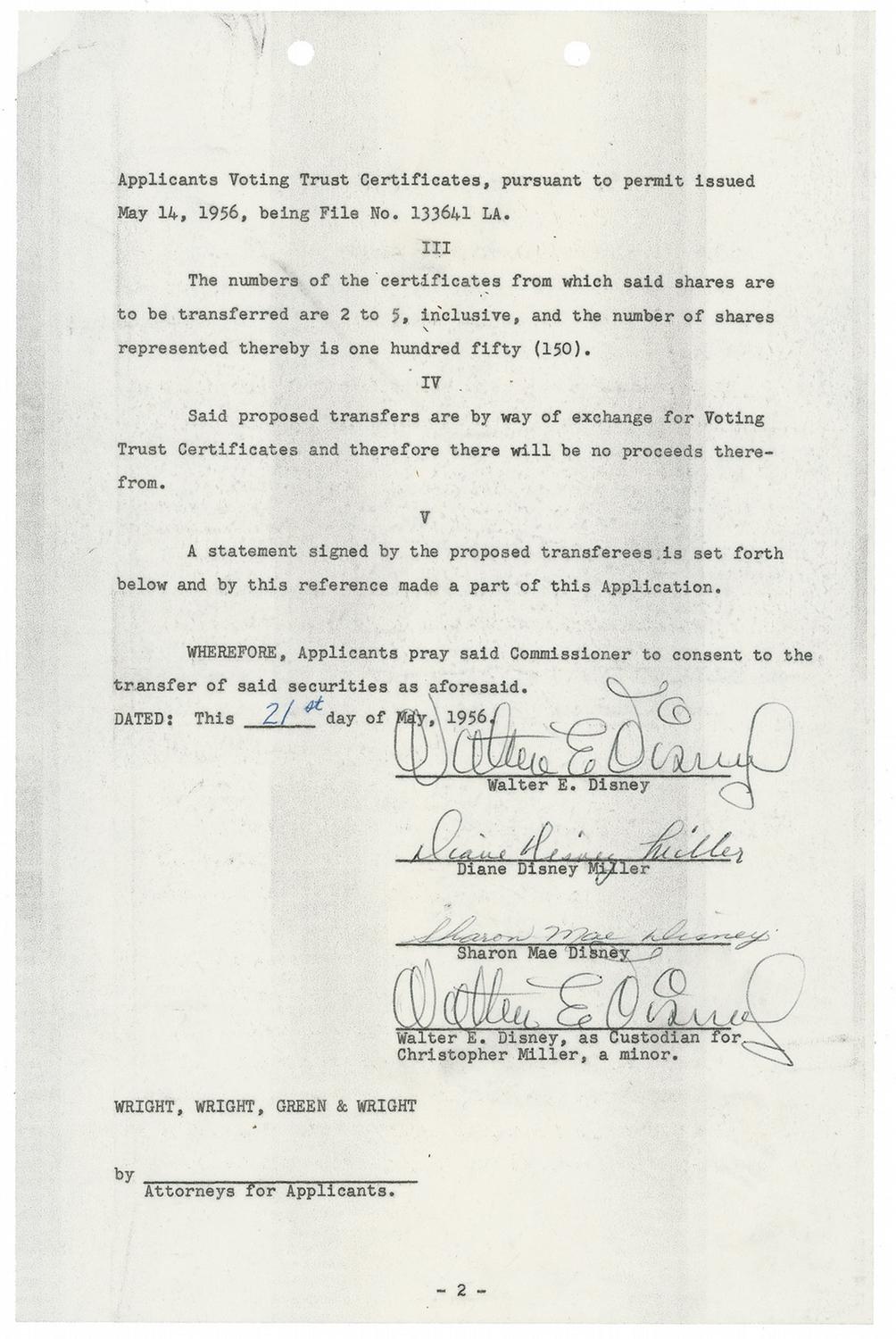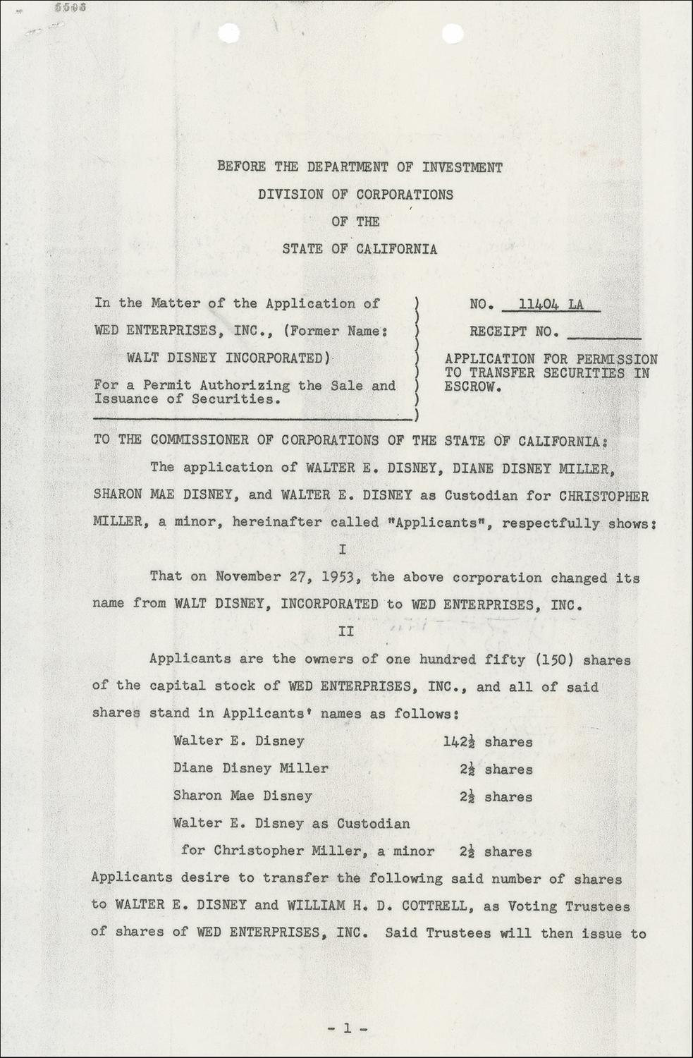 DS, signed “Walter E. Disney,” three pages, 8.5 x 13, May 21, 1956. Document entitled “Application for Permission to Transfer Securities in Escrow.” In part: “The application of Walter E. Disney, Diane Disney Miller, Sharon Mae Disney, and Walter E. Disney as Custodian for Christopher Miller, a minor…respectfully shows that on November 27, 1953, the above corporation changed its name from Walt Disney, Incorporated to WED Enterprises, Inc….Applicants desire to transfer the following said number of shares to Walter E. Disney and William H. D. Cottrell, as Voting Trustees of shares of WED Enterprises, Inc.” Signed twice at the conclusion of the second page, “Walter E. Disney,” and also signed by Diane Disney Miller and Sharon Mae Disney. Walt Disney has again signed the third page, along with Cottrell. In fine condition, with a diagonal crease to the last page, two filing punch holes at the top of each page, and scattered carbon soiling.