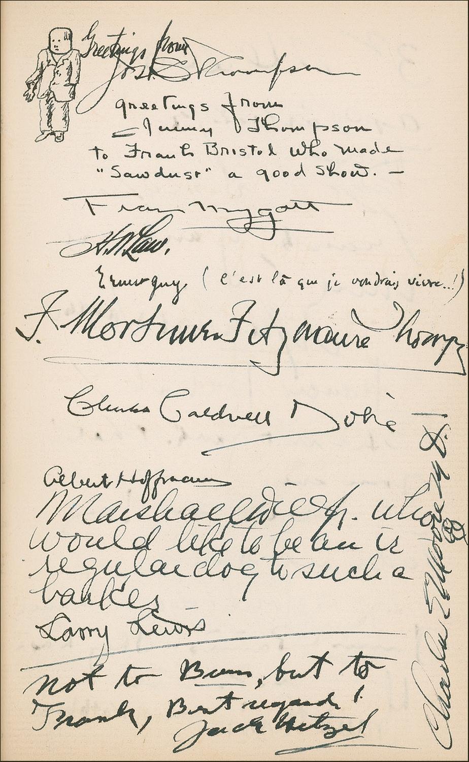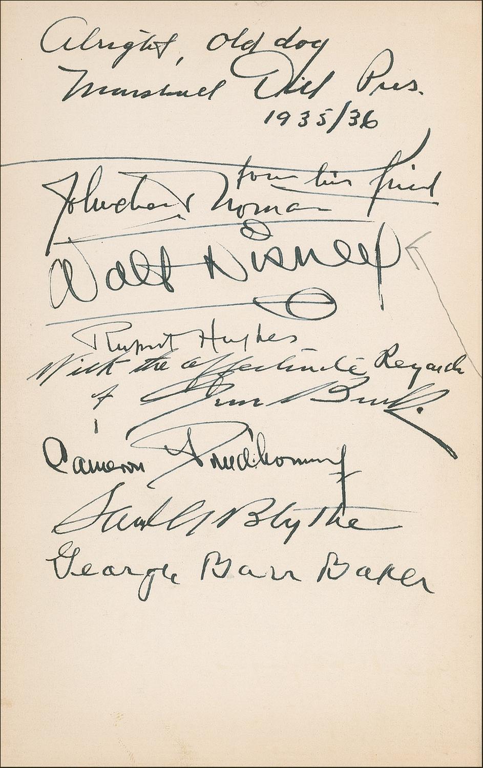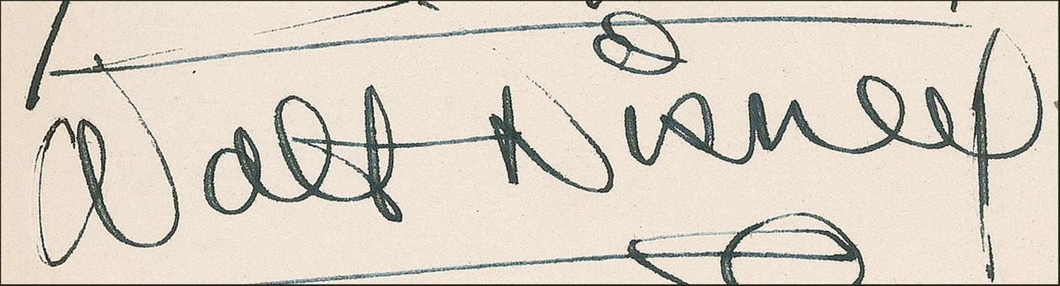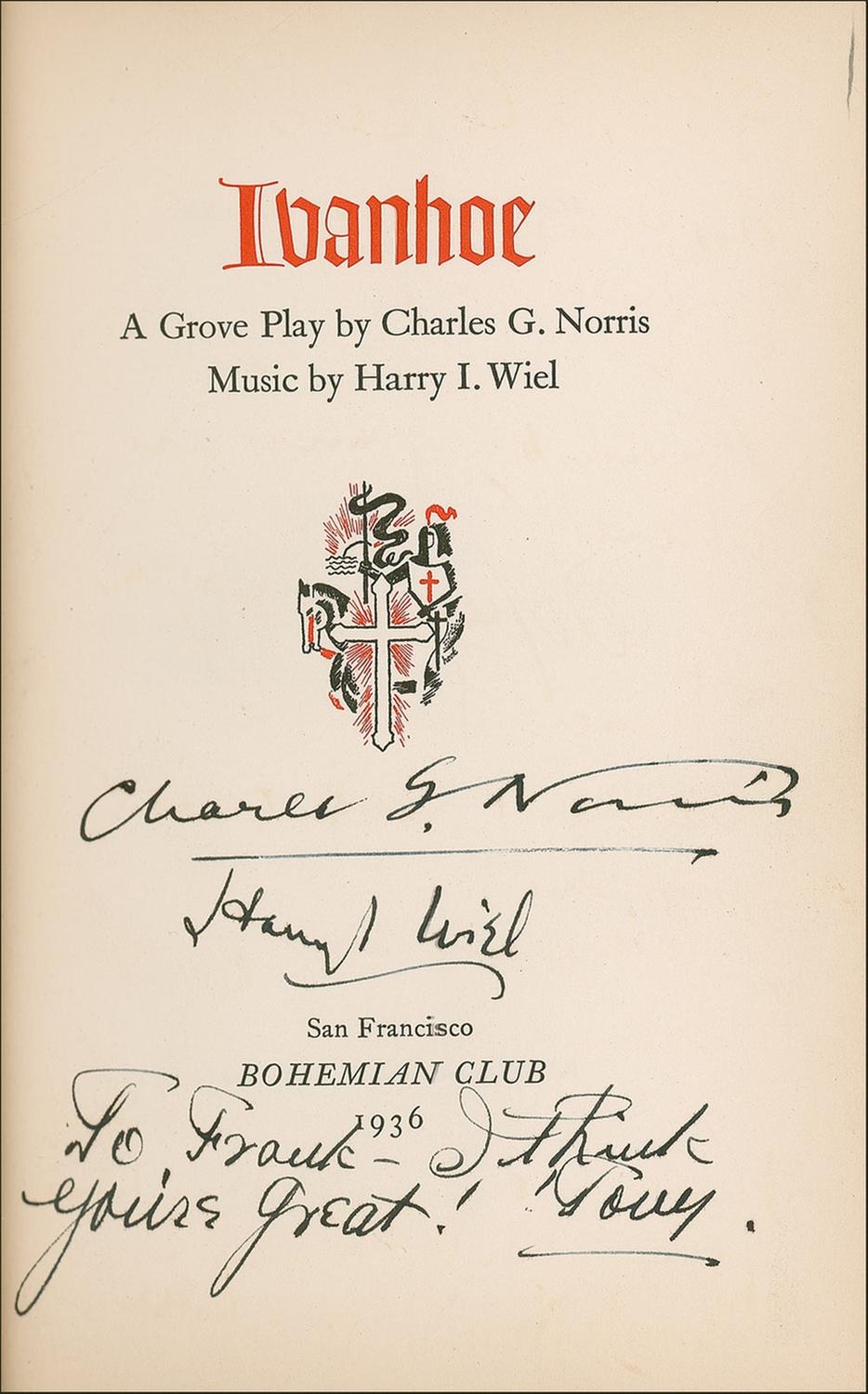 Signed book: Ivanhoe: A Grove Play by Charles G. Norris. Private edition. San Francisco: Bohemian Club, 1936. Hardcover, 5.25 x 8, 107 pages. Signed on the inside front cover, opening pages, and closing pages by 83 members of the Bohemian Club, highlighted by the bold signature, “Walt Disney” on the inside front cover (with an arrow drawn to his name in an unknown hand). Other members have signed in ink and include: Charles G. Norris, Harry I. Weil, Rupert Hughes, and Templeton Crocker. Many of the signatures are inscribed to “Frank.” In fine condition, with some scattered mild toning, a bit of light soiling, sunning to the spine, and some chipping to the spine’s label.