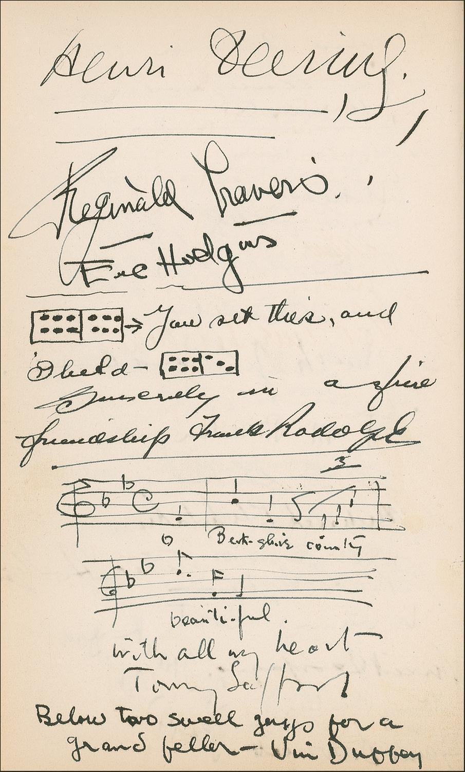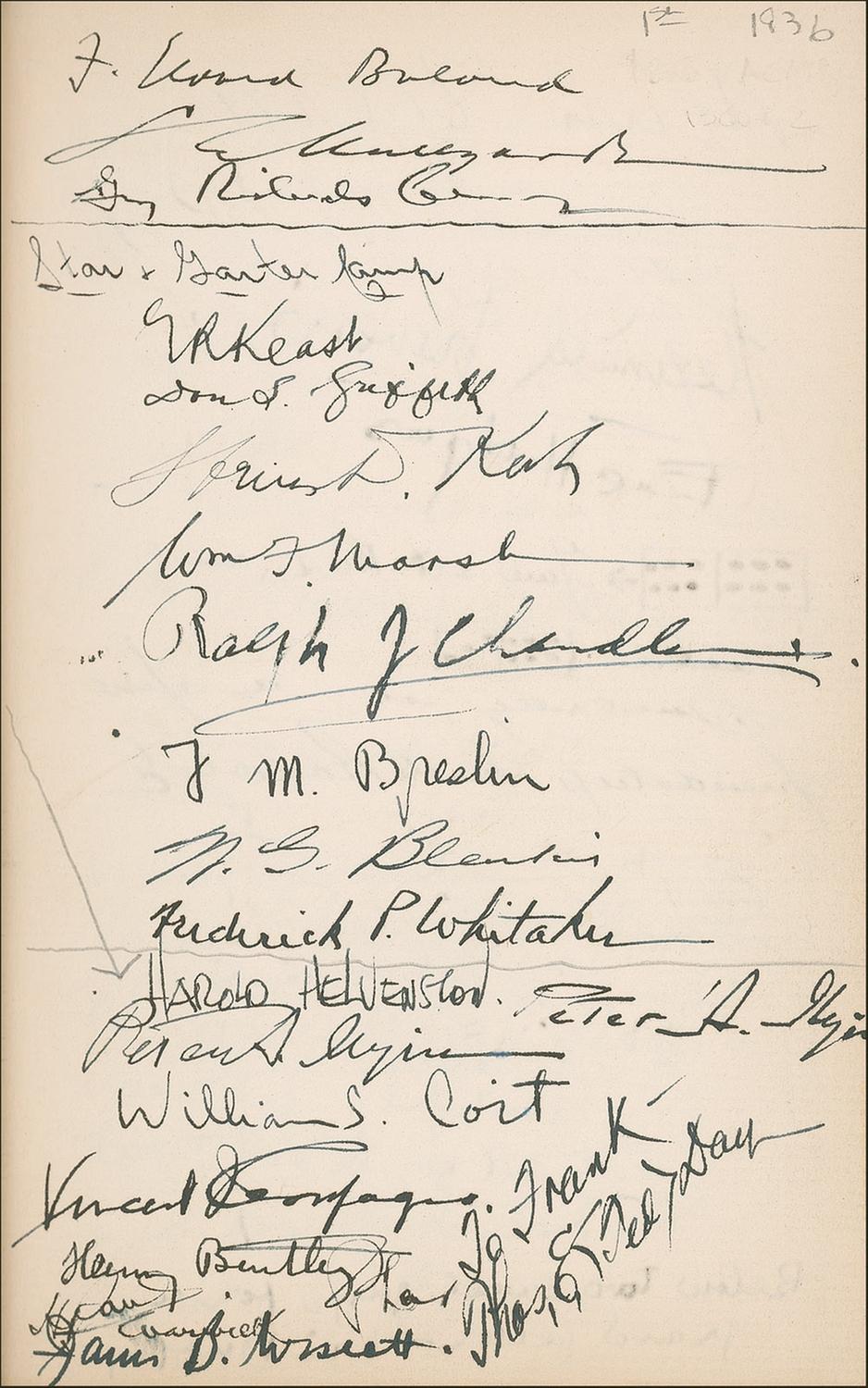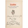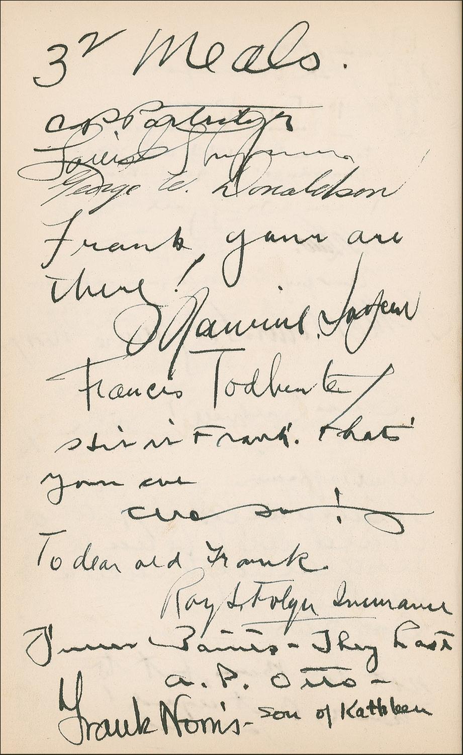 Signed book: Ivanhoe: A Grove Play by Charles G. Norris. Private edition. San Francisco: Bohemian Club, 1936. Hardcover, 5.25 x 8, 107 pages. Signed on the inside front cover, opening pages, and closing pages by 83 members of the Bohemian Club, highlighted by the bold signature, “Walt Disney” on the inside front cover (with an arrow drawn to his name in an unknown hand). Other members have signed in ink and include: Charles G. Norris, Harry I. Weil, Rupert Hughes, and Templeton Crocker. Many of the signatures are inscribed to “Frank.” In fine condition, with some scattered mild toning, a bit of light soiling, sunning to the spine, and some chipping to the spine’s label.