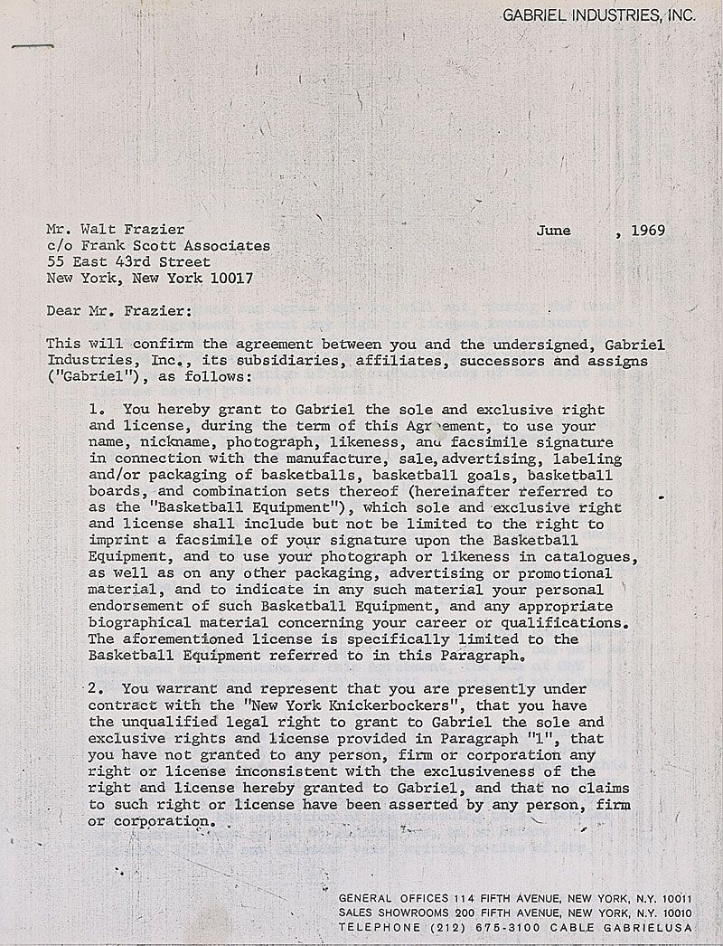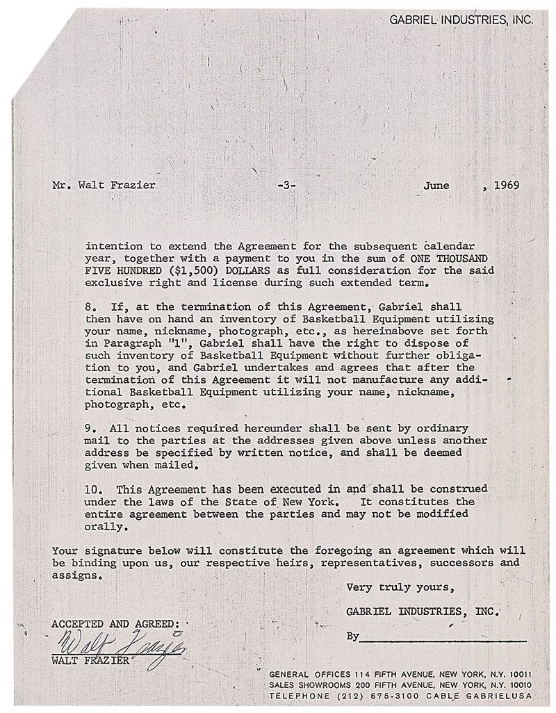 DS three pages, 8.5 x 11, June 1969. Agreement between Frazier and Gabriel Industries to use Frazier’s name, nickname, and likeness on various pieces of basketball equipment for a payment of $1500, with the option of renewal at the same price. Signed on the last page by Frazier. In fine condition, a staple to top left.
