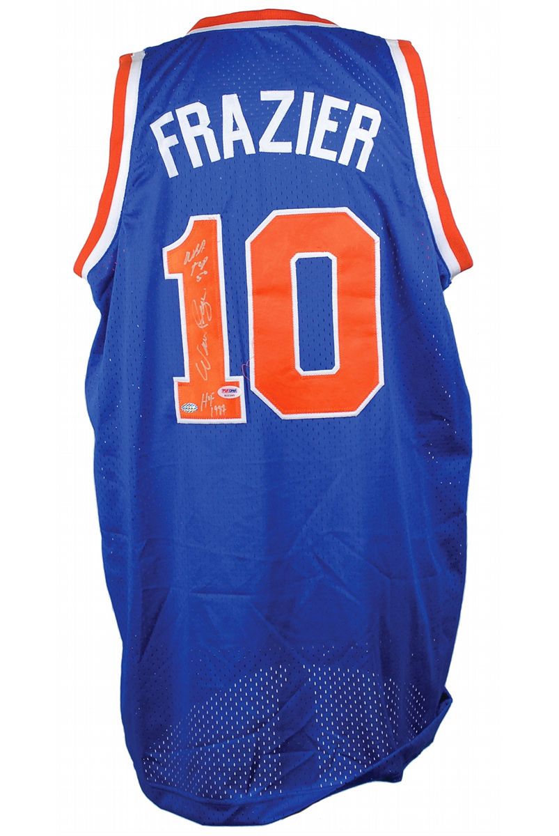 Replica New York Knicks basketball jersey, with sewn on letters and numbers, signed in silver ink on the number on the back, “Walt Frazier, NBA Top 50, HOF 1997.” In fine condition, with a PSA/DNA label affixed to the number. Accompanied by a certificate of authenticity from PSA/DNA.