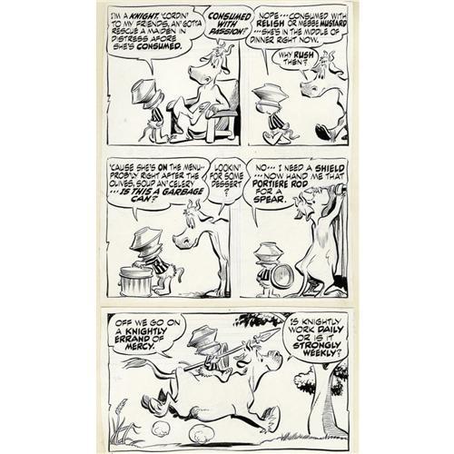 <B>Walt Kelly - Beau Pogo Book, page 17 Original Art (Simon and Schuster, 1960).</B></I> Pogo rides a cow on a knightly errand of mercy, in this noble page by Walt Kelly. The top two tiers and the lower tier have been drawn on separate pieces of bristol, and mounted to a larger board. The image area measures 9" x 17". In Very Good condition.<BR><BR><b>Shipping:</b> Small Flat (<a target="_blank" href="http://www.heritageauctions.com/common/shipping.php">view shipping information</a>)