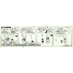 <B>Walt Kelly - Pogo Daily Comic Strip Original Art, dated 1-29-58 (The Hall Syndicate, 1958).</B></I> However you want to analyze it, <I>Pogo</B></I> is undeniably the most self-reflective strip in the history of comics. Walt Kelly often engaged in social and political satire through the adventures of the strip's funny animals, touching on a whole range of subjects with tongue firmly in furry cheek. This daily from January 29, 1958 tackles the subject of science experiments and cross-breeding, all told in Kelly's home-spun style. This strip measures 5" x 18.5" and is attractively matted and framed. In Excellent condition.