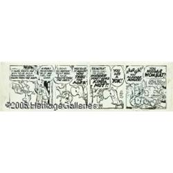 <B>Walt Kelly - Pogo Daily Comic Strip Original Art, dated 7-2-64 (Hall Syndicate, 1964).</B></I> Walt Kelly fans will treasure this delightful <I>Pogo</B></I> strip from the mid-sixties. A Newslife crew searches for Pogo, and find him they do in this daily dated 7-2-64. The image area of this daily is 18.5" x 5" and the art is in Excellent condition. Go <I>Pogo</B></I> with this delightful Walt Kelly art.