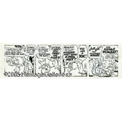 <B>Walt Kelly - Pogo Daily Comic Strip Original Art, dated 4-25-66 (The Hall Syndicate, 1966).</B></I> Howland Owl and Churchy take verbal jabs at each other until it escalates into the inevitable, in this frantic four-paneled farce dated 4-25-66, by a patriarch of parody, Walt Kelly. This strip measures 5" x 18.5" and aside from one minor stain on the right edge outside the image area, is in Excellent condition. A tale of age and dignity by a master of wit, Walt Kelly! Don't be a yok... bid now!