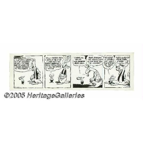 <B>Walt Kelly - Pogo Daily Comic Strip Original Art, dated 4-20-61 (Hall Syndicate, 1961).</B></I> Besides being a skilled illustrator, former Walt Disney Studio animator, Walt Kelly, had a good ear for language, and often created new words to fit his characters. You can tell by the exuberance of this daily, that Kelly was certainly having fun writing this strip! Kelly's blue penciling can be seen beneath his inks. The image area is 18.5"" x 5"", and the art is in Excellent condition. <BR><BR><B>Important notice:</B> Heritage usually auctions material at the rate of 200-250 lots per hour. On some occasions eBay Live bid software or the Internet may not be able to keep up with the pace of the auction. We recommend placing a realistic absentee bid now as insurance to avoid disappointment. Occasionally the auctioneer may eliminate or reject an eBay Live bid, and the auctioneer may also reopen a lot after the close of the eBay live bidding (usually because we missed an audience bid), and may reject your bid even if it shows you as the winning bidder. By bidding via eBay Live, you agree that Heritage may award the lot to another bidder at its sole discretion under the circumstances described above or any other reasonable circumstances. Since eBay bids are not shown to us until we open the lot on the floor, we treat those bids just like floor bids. In most cases the floor responds before the eBay bid is presented to us, due to Internet lag time, so for consistency we have made it a policy that floor bids are always considered first over tie eBay live bids. Also please note that all Heritage lots purchased through eBay Live carry a 20% Buyer's Premium. Please make sure you read the Terms and Conditions before you bid. This lot is being auctioned in conjunction with a live floor auction by Heritage Galleries & Auctioneers. All final auction and invoice information will be supplied by Heritage Galleries & Auctioneers, and all other information should be considered preliminar