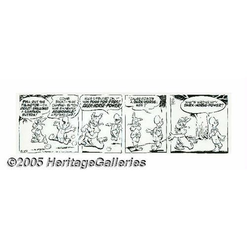 <B>Walt Kelly - Pogo Daily Comic Strip Original Art, dated 4-19-68 (Hall Syndicate, 1968).</B></I> Howland Owl goes into a panic after swallowing an ""eminently edibobble"" ""Pogo for Pres"" campaign button. Walt Kelly's ever-popular <I>Pogo</B></I> was a witty, political kick in the shins, brought to life by a comedy master. Kelly's blue penciling can be seen beneath his inks. The image area is 20"" x 5.5"", and the art is in Excellent condition. <BR><BR><B>Important notice:</B> Heritage usually auctions material at the rate of 200-250 lots per hour. On some occasions eBay Live bid software or the Internet may not be able to keep up with the pace of the auction. We recommend placing a realistic absentee bid now as insurance to avoid disappointment. Occasionally the auctioneer may eliminate or reject an eBay Live bid, and the auctioneer may also reopen a lot after the close of the eBay live bidding (usually because we missed an audience bid), and may reject your bid even if it shows you as the winning bidder. By bidding via eBay Live, you agree that Heritage may award the lot to another bidder at its sole discretion under the circumstances described above or any other reasonable circumstances. Since eBay bids are not shown to us until we open the lot on the floor, we treat those bids just like floor bids. In most cases the floor responds before the eBay bid is presented to us, due to Internet lag time, so for consistency we have made it a policy that floor bids are always considered first over tie eBay live bids. Also please note that all Heritage lots purchased through eBay Live carry a 20% Buyer's Premium. Please make sure you read the Terms and Conditions before you bid. This lot is being auctioned in conjunction with a live floor auction by Heritage Galleries & Auctioneers. All final auction and invoice information will be supplied by Heritage Galleries & Auctioneers, and all other information should be considered preliminary. Lot:4234 <BR><BR><B>Winning Notific
