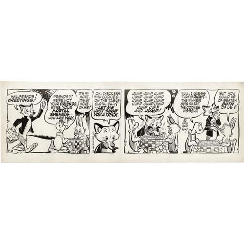 <B>Walt Kelly - Pogo Daily Comic Strip Original Art, dated 1-2-58 (Hall Syndicate, 1958).</B></I> Seminole Sam gets the jump on Churchy and Bun Rab in this delightful daily. Sweet and sassy, this Walt Kelly strip has an image area of 16" x 4.5". In Excellent condition.<BR><BR><b>Shipping:</b> Small Flat (<a target="_blank" href="http://www.heritageauctions.com/common/shipping.php">view shipping information</a>)