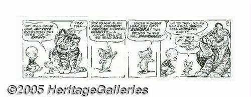 <B>Walt Kelly - Pogo Daily Comic Strip Original Art, dated 9-28-66 (Hall Syndicate, 1966).</B></I> Without long-winded figures quite full of themselves, <I>Pogo</B></I> would have been less entertaining as a comic strip. That is certainly true in this daily from September 28, 1966, as Pogo's furry little friend dishes out a bit of verbal bombast to a captive audience. This mouse may be small in stature but he's big in bluster! And how many strips can boast of the appearance of a sabre-tooth tiger -- especially one as beautifully rendered as this casual cat? Aside from its captivating humor, Walt Kelly's beautiful penmanship is the star of this strip! This strip has an image area of 18.5" x 5" and is in Excellent condition.
