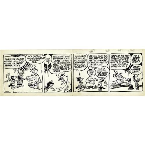 <B>Walt Kelly - Pogo Daily Comic Strip Original Art, dated 9-17-56 (Hall Syndicate, 1956).</B></I> Choo Choo, the mailman duck, does some fancy figuring on postage due, with the kind of snappy patter that made Pogo a fan-favorite. This daily has an image area of approximately 16" x 4.5". The strip was cut and folded between panels two and three, then taped together; otherwise, the art is in Very Good condition. <BR><BR><b>Shipping:</b> Flat Material, Small (<a target="_blank" href="http://www.heritageauctions.com/common/shipping.php">view shipping information</a>)