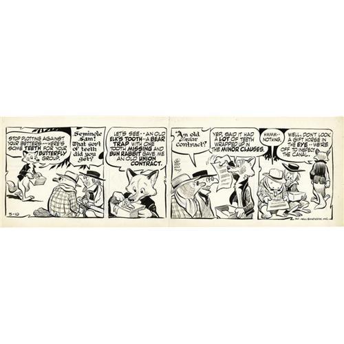 <B>Walt Kelly - Pogo Daily Comic Strip Original Art, dated 5-10-57 (Hall Syndicate, 1957).</B></I> Seminole Sam, Deacon Mushrat, and Molester Mole star in this Cold War-era classic. It's another mirthful masterpiece from Walt Kelly. This daily has an image area of approximately 16" x 4.5", and the art is in Excellent condition. <BR><BR><b>Shipping:</b> Flat Material, Small (<a target="_blank" href="http://www.heritageauctions.com/common/shipping.php">view shipping information</a>)