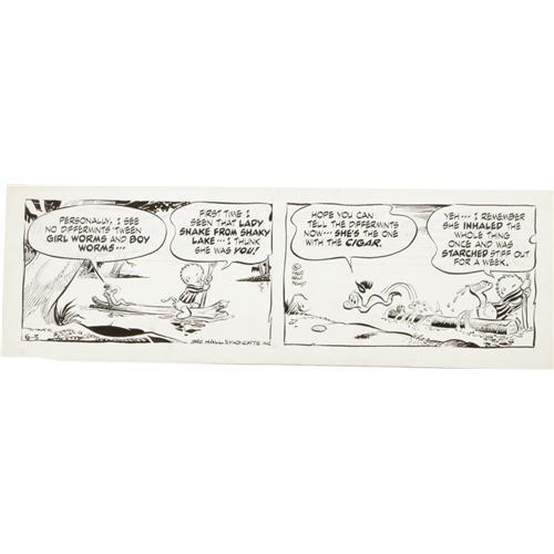 <B>Walt Kelly - Pogo Daily Comic Strip Original Art, dated 6-5-65 (Hall Syndicate, 1965).</B></I> It's another lazy, crazy day in Okefenokee Swamp in this rib-tickler starring Pogo. This daily has an image area of approximately 18.5" x 5", and the art is in Excellent condition. <BR><BR><b>Shipping:</b> Flat Material, Large (<a target="_blank" href="http://www.heritageauctions.com/common/shipping.php">view shipping information</a>)