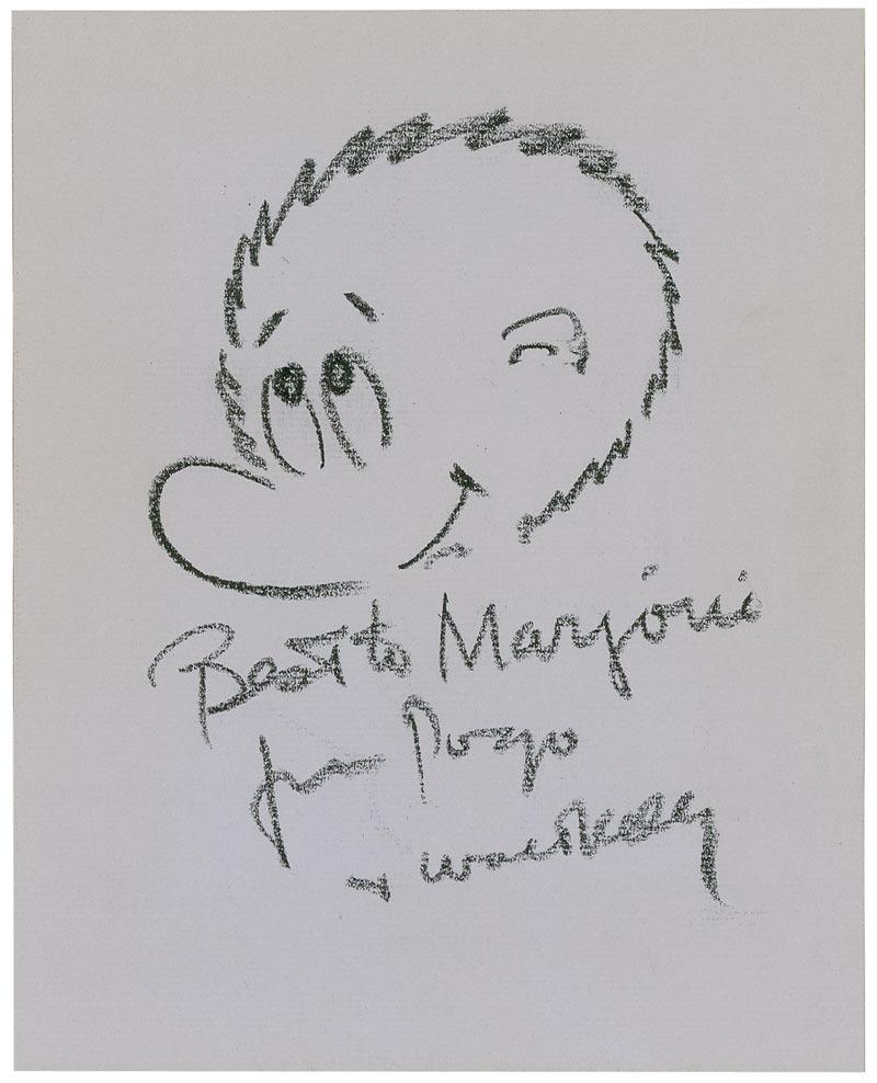 Original signed and inscribed black crayon sketch of Pogo on a light gray 8 x 10 sheet, signed and inscribed “Best to Marjorie from Pogo & Walt Kelly.” In fine condition, with scattered surface wear.