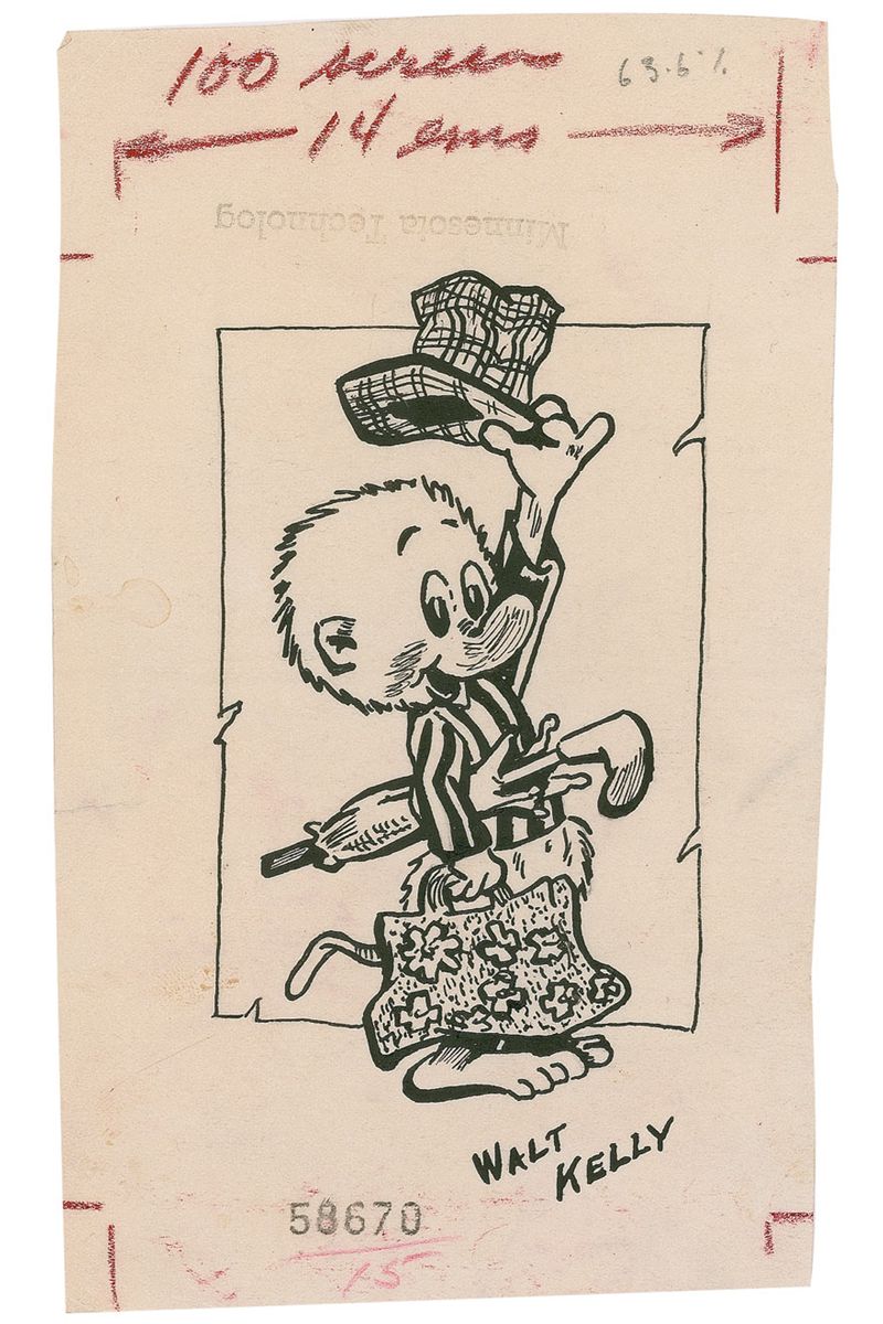 Original vintage ink production drawing of Pogo tipping his hat and holding an umbrella under his arm, 4.25 x 7.25, signed at the bottom in black ink, “Walt Kelly.” In fine condition, with several pencil and crayon production notations to edges, as well as a “Minnesota Technolog” stamp at the top.