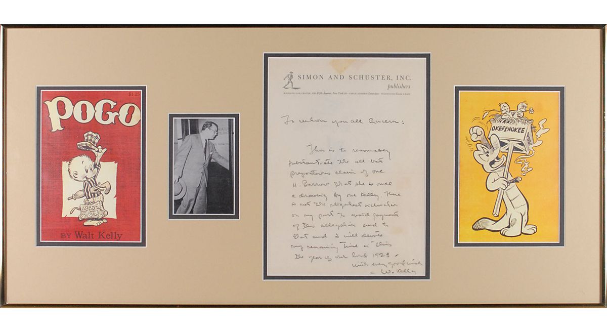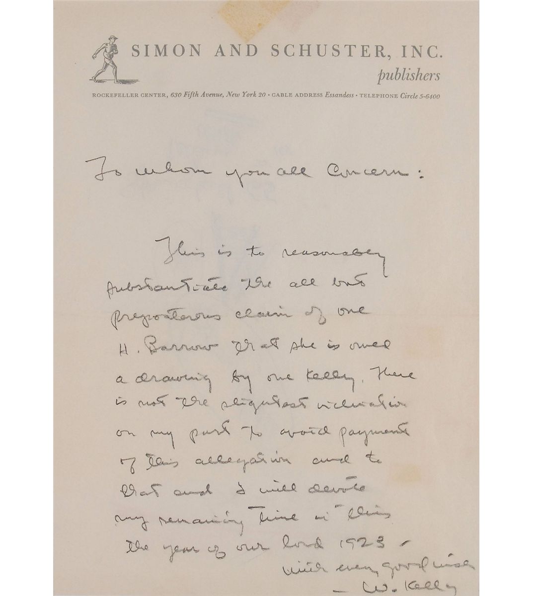 Humorous ALS signed “W. Kelly,” one page, 7.5 x 10.5, Simon and Schuster letterhead, 1923. Response to a request for a drawing. In full: “This is to reasonably substantiate the all out preposterous claim of one H. Barrow that she is owed a drawing by one Kelly. There is not the slightest inclination on my part to avoid payment of this allegation and to that and I will devise my remaining time in this the year of our Lord 1923.” Double-matted and framed with three images to an overall size of 30 x 14. Various areas of toned adhesive remnants and some show-through from writing to reverse, otherwise fine condition. Oversized.