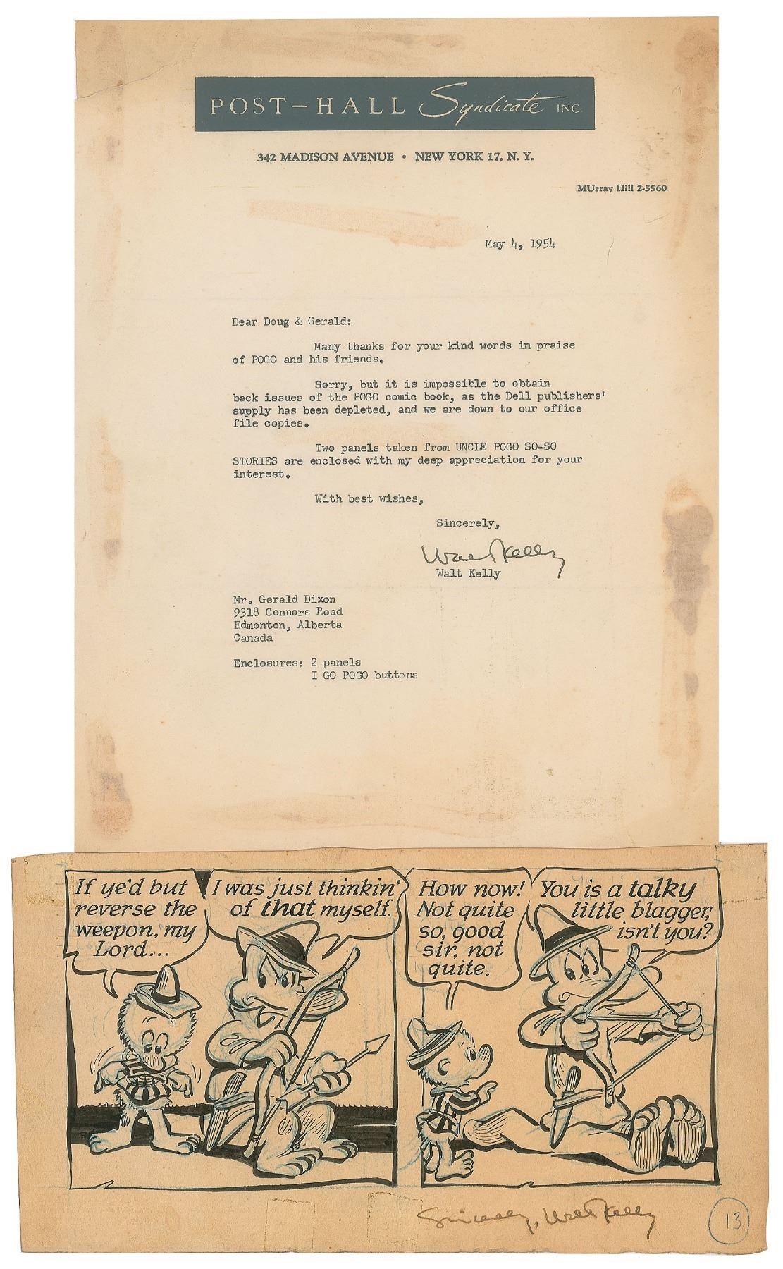 Two items: a TLS, one page, 8.5 x 11, Post-Hall Syndicate letterhead, May 4, 1954, in full: "Many thanks for your kind words in praise of Pogo and his friends. Sorry, but it is impossible to obtain back issues of the Pogo comic book, as the Dell publishers' supply has been depleted, and we are down to our office file copies. Two panels taken from Uncle Pogo So-So Stories are enclosed with my deep appreciation for your interest." The second item is the referenced two-panel Uncle Pogo comic strip, 9.75 x 5.25, accomplished in colored pencil and ink by Kelly, who draws two scenes of Pogo Possum and Albert Alligator making sense of how to use a bow and arrow. After Pogo instructs Albert to "reverse the weapon," the second panel depicts the alligator pointing the arrow in the wrong direction, with Pogo exclaiming, "How now! Not quite so, good sir, no quite," and Albert replying, "You is a talky little blagger, isn't you?" Signed in the lower border in fountain pen, "Sincerely, Walt Kelly." In overall very good to fine condition, with light toning to the artwork, and staining and an edge tear to the letter.