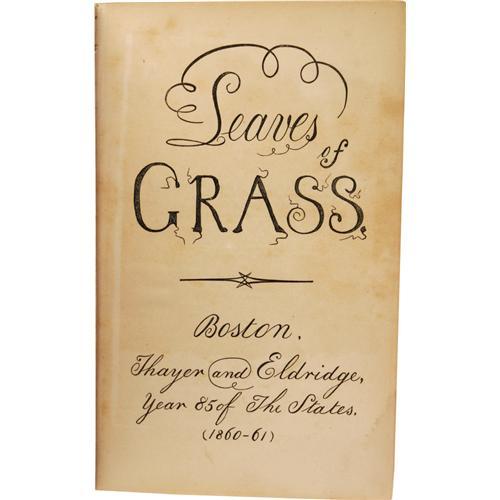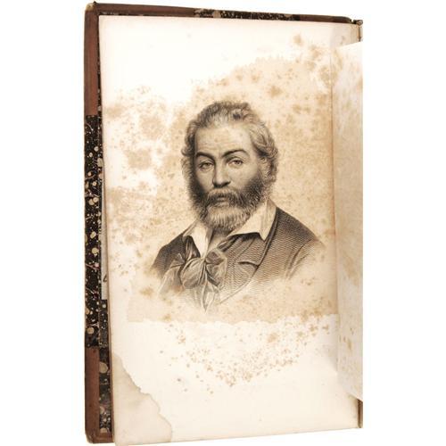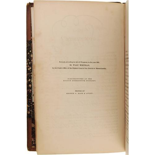 <B>Walt Whitman:<I> Leaves of Grass.</B></I></B></I> (Boston: Thayer and Eldridge, 1860), first edition of this printing, "Entered, according to Act of Congress, in the year 1860, by WALT WHITMAN, In the Clerk's Office of the District Court of the District of Massachusetts. Electrotyped at the Boston Stereotype Foundry. Printed by George C. Rand & Avery" on the copyright page, 456 pages, engraved frontis of Whitman, marbled endpapers, half leather binding with marbled boards, gilt titles and spine decoration, marbled page edges, 12mo (5.25" x 7.75"), Charles E. Perkins ex-libris on the inside front cover, moderate wear to leather surfaces, portion of spine label torn off affecting titles, inside front hinge broken but easily repaired, frontis and title page moderately foxed, else an early copy of this beloved work in good condition.<BR><BR><b>Shipping:</b> Books & Catalogs (<a target="_blank" href="http://www.heritageauctions.com/common/shipping.php">view shipping information</a>) <BR><BR><B>Important notice:<