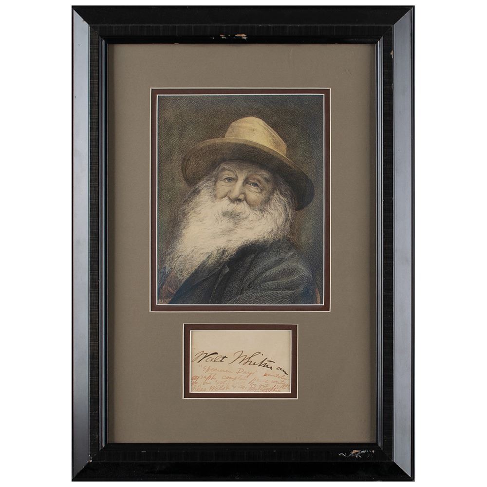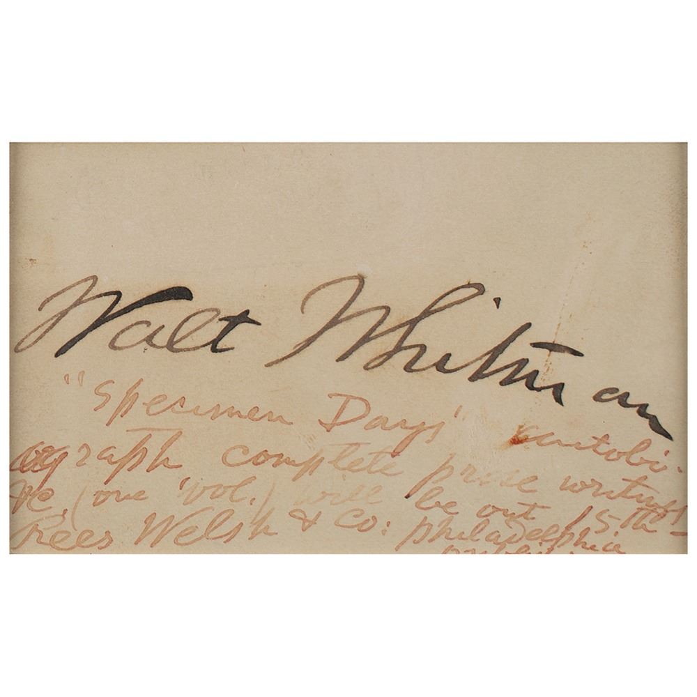 An off-white 3.75 x 2.25 card signed in fountain pen by Walt Whitman, who below adds a few lines regarding his 1882 work 'Specimen Days and Collect'‰ÛÓ"'Specimen Days' autobiograph complete prose writings etc (one vol) will be out 15th‰ÛÓRees Welsh & Co: Philadelphia, publisher." Double-matted and framed with an artistic portrait of Whitman to an overall size of 13 x 13 x 17.5. In fine condition, with some wear to the frame.