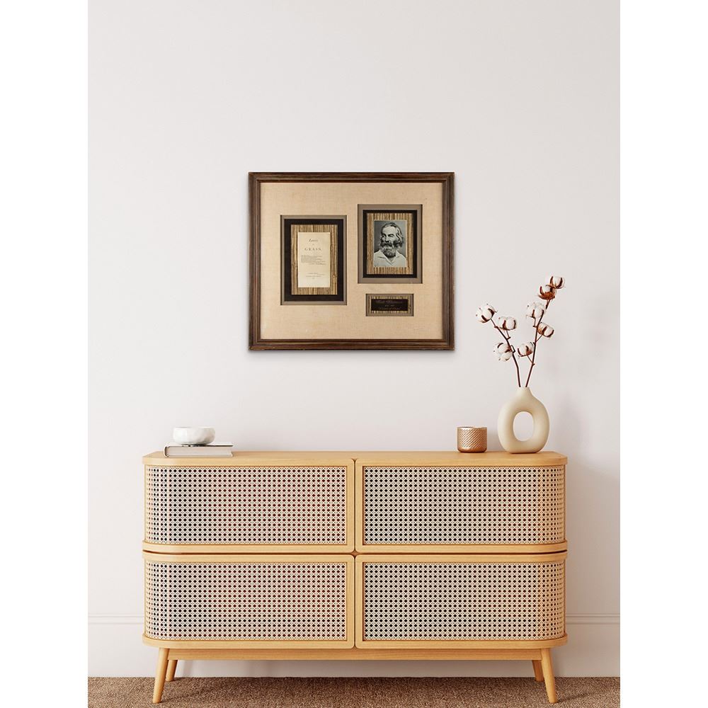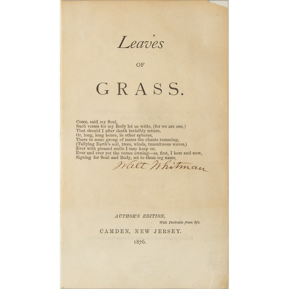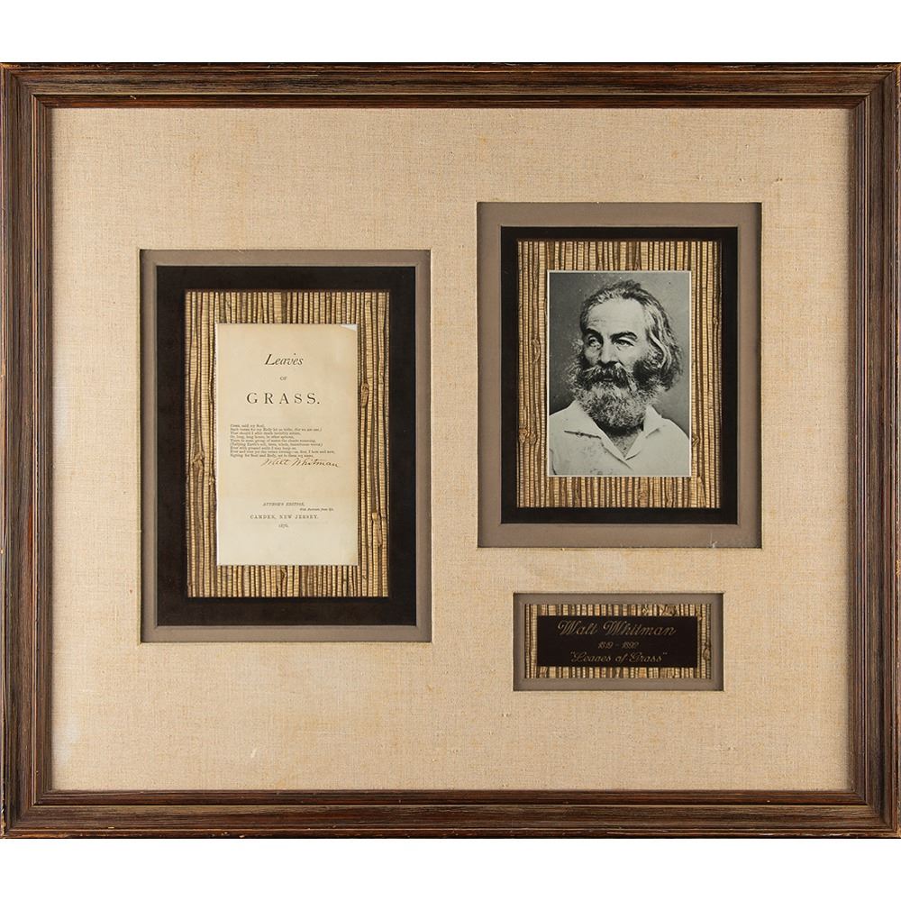 Title page from the 1876 'Author's Edition' of Whitman's renowned poetry collection Leaves of Grass, 4.75 x 7.5, published in Camden, New Jersey, in 1876, neatly signed in ink, "Walt Whitman." The page features the text of his poem, 'Come, said my Soul,' which he used as the title-page epigraph for Leaves of Grass. Handsomely mounted, cloth-matted, and framed with a portrait and plaque to an overall size of 28 x 24. In fine condition, with faint toning, and minor loss to the upper right corner tip.