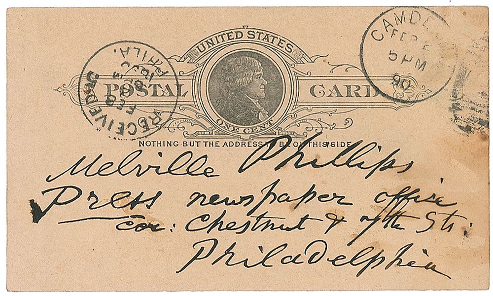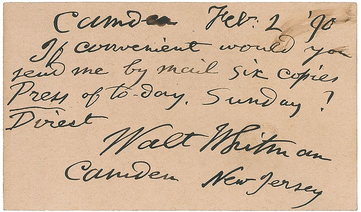 Brief ALS, on a 5 x 3 postcard, February 2, 1890. To Melville Phillips at the Philadelphia Press Newspaper Office. In full: “If convenient would you send me by mail six copies Press of to-day. Sunday? Direct.” Reverse is addressed in Whitman’s hand to Phillips. In fine condition, with a uniform shade of mild toning, a light brush to top right affecting small portion of date and text, and a couple brushes and soiling to address side. Taken from ‘With Walt Whitman in Camden, Volume 6’ by Horace Traubel: ‘Monday, February 3, 1890…Said the appearance of his little piece in yesterday's Press was ‘the first notion’ he had that ‘it was bought by a syndicate.’’