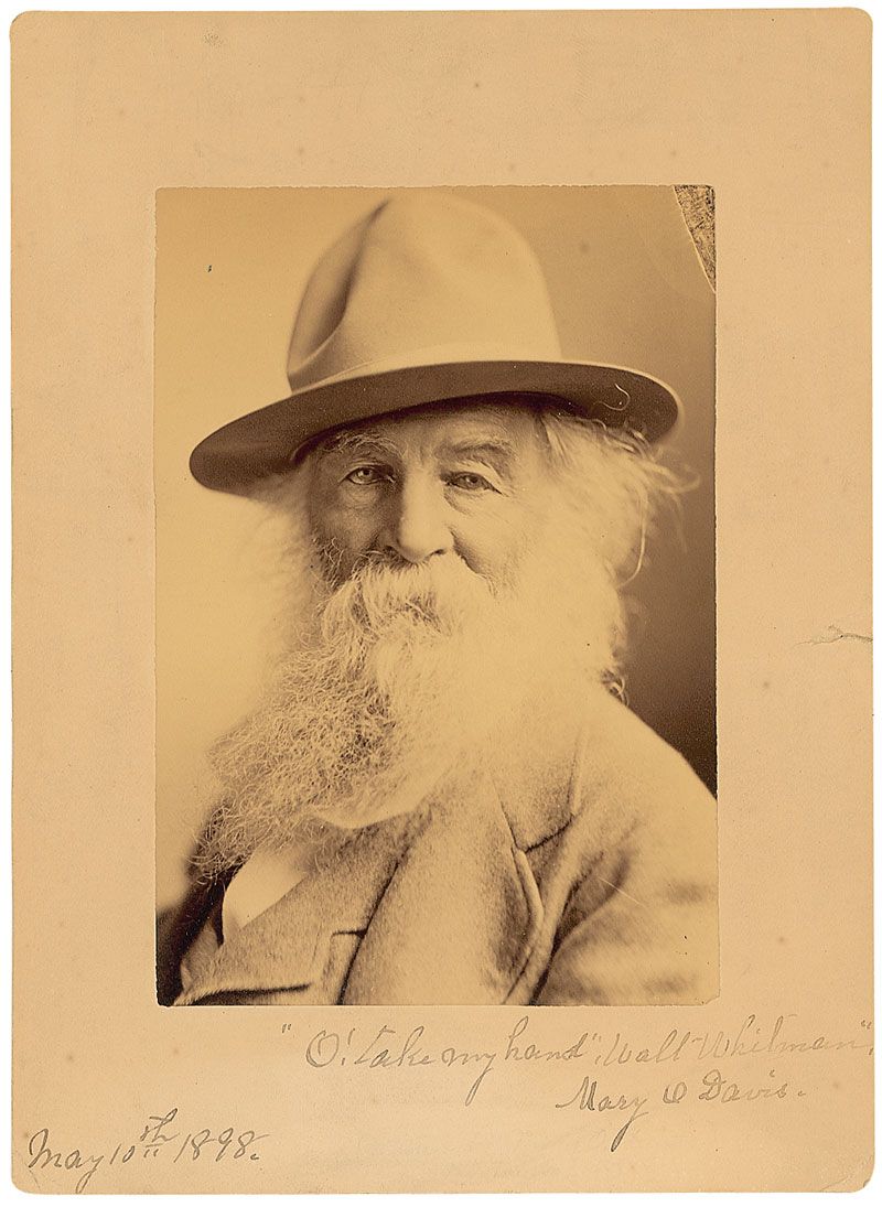 Original 4 x 6 albumen photo of Whitman, affixed to its original 6.25 x 8.5 mount, with a notation written on the mount by Whitman’s housekeeper Mary Davis, “’O! Take my hand.’ Walt Whitman, Mary O. Davis, May 10th 1898.” A tear to right edge of mount, some light rippling, and a light horizontal line through facial area, otherwise fine condition. Reverse bears a lengthy pencil notation detailing the history of the photo.