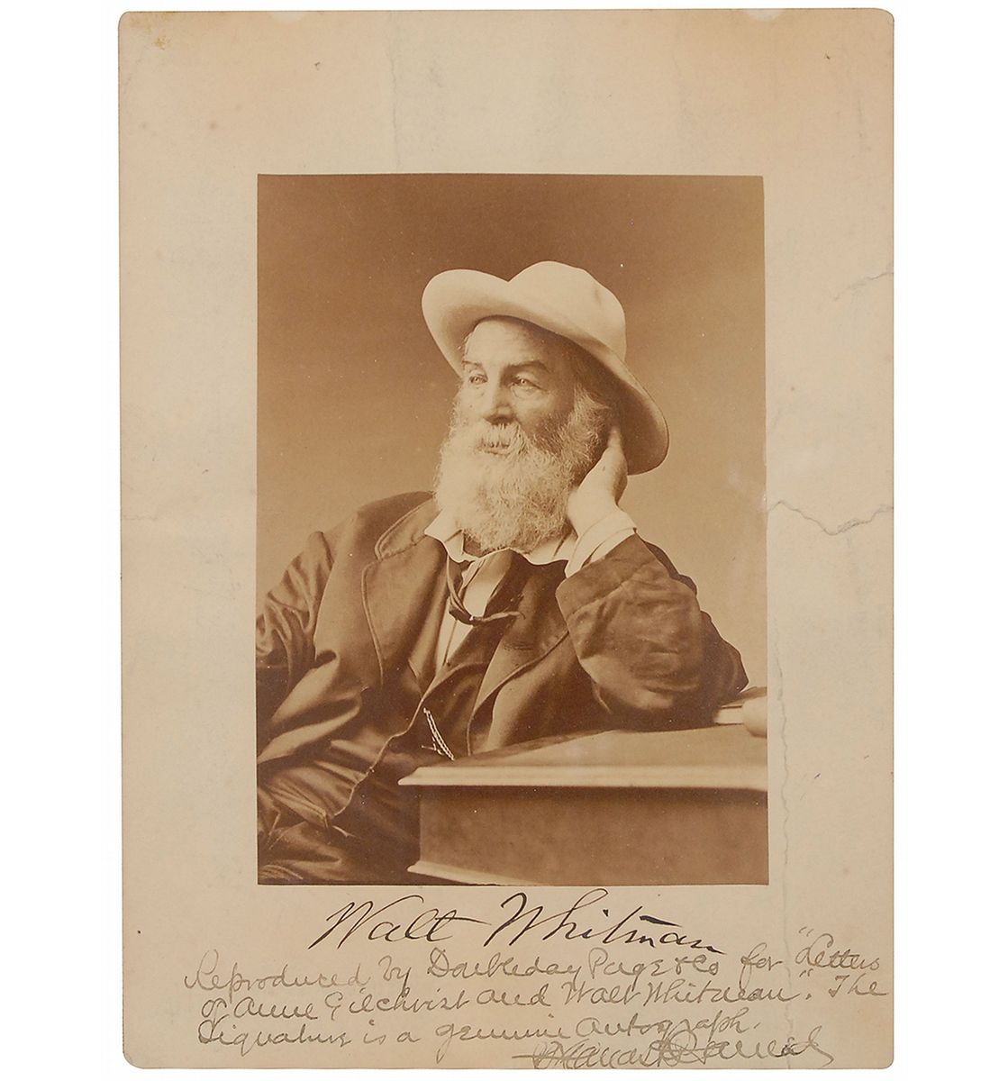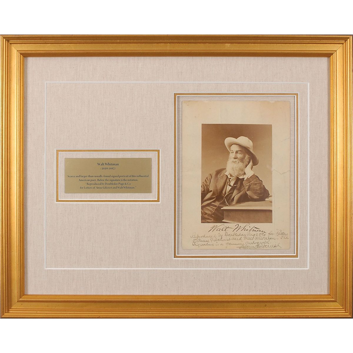 Scarce vintage 4 x 5.5 photo of Whitman resting his head in his hand, affixed to its original 6 x 8.5 mount, signed on the mount in black ink, “Walt Whitman.” Notation in another hand under signature states, “Reproduced by Doubleday Page & Co for ‘Letters of Anne Gilchrist and Walt Whitman.’ The signature is a genuine autograph.” Very nicely archivally double-cloth-matted and framed with a descriptive plaque to an overall size of 19.5 x 16. In very good condition, with silvering to image (visible only at an angle), a couple repaired tears to mount, and some scattered light toning, creasing, and soiling to mount. A crystal-clear portrait of the great American poet, larger than usually encountered.