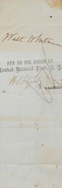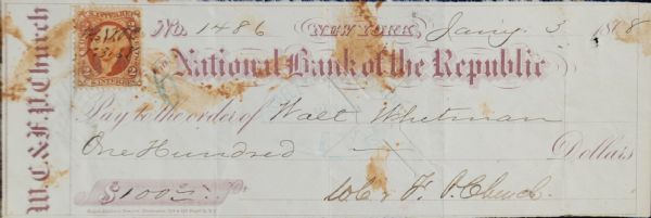 Endorsed bank check, 8 x 2.5, filled out in another hand and signed by W. C. & F. P. Church, payable to Whitman for $100.00, January 3, 1868. Endorsed on the reverse in black ink by Whitman. In good condition, with several vertical folds, cancellation cut to center, scattered light toning and soiling,, and a revenue stamp affixed to front. This is Whitman requested price for articles written by Whitman for Church.