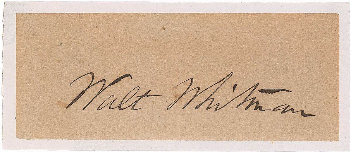 Ink signature, “Walt Whitman,” on an off-white 4.5 x 1.75 slip affixed to a slightly larger sheet. In fine condition, with small tears to top edge and slight spotting.