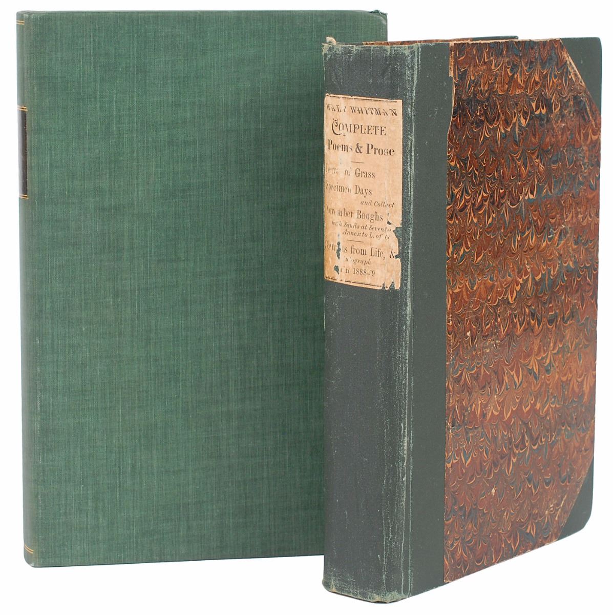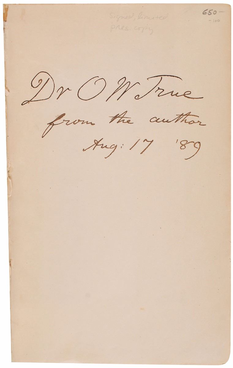 Signed book: Complete Poems and Prose of Walt Whitman. First edition, limited issue, numbered 188/600. Philadelphia: Ferguson Bros., 1888–1889. Hardcover, 7 x 10.5, 898 pages. Signed and inscribed on the first free end page in black ink, “Dr. O. W. True, from the author, Aug: 17 ’89.” Autographic condition: fine0. Book condition: VG-/None, in a VG+ custom-made slipcase. In the published volumes of Whitman’s Daybooks and Notebooks, he records sending out two copies of this edition on August 17, 1889, with one entry reading: ‘Sent big book to J H Clifford, Farmington, Maine, paid 4, by Express, (for Dr O W True).’ An extremely desirable definitive edition of Whitman’s work with superb provenance.