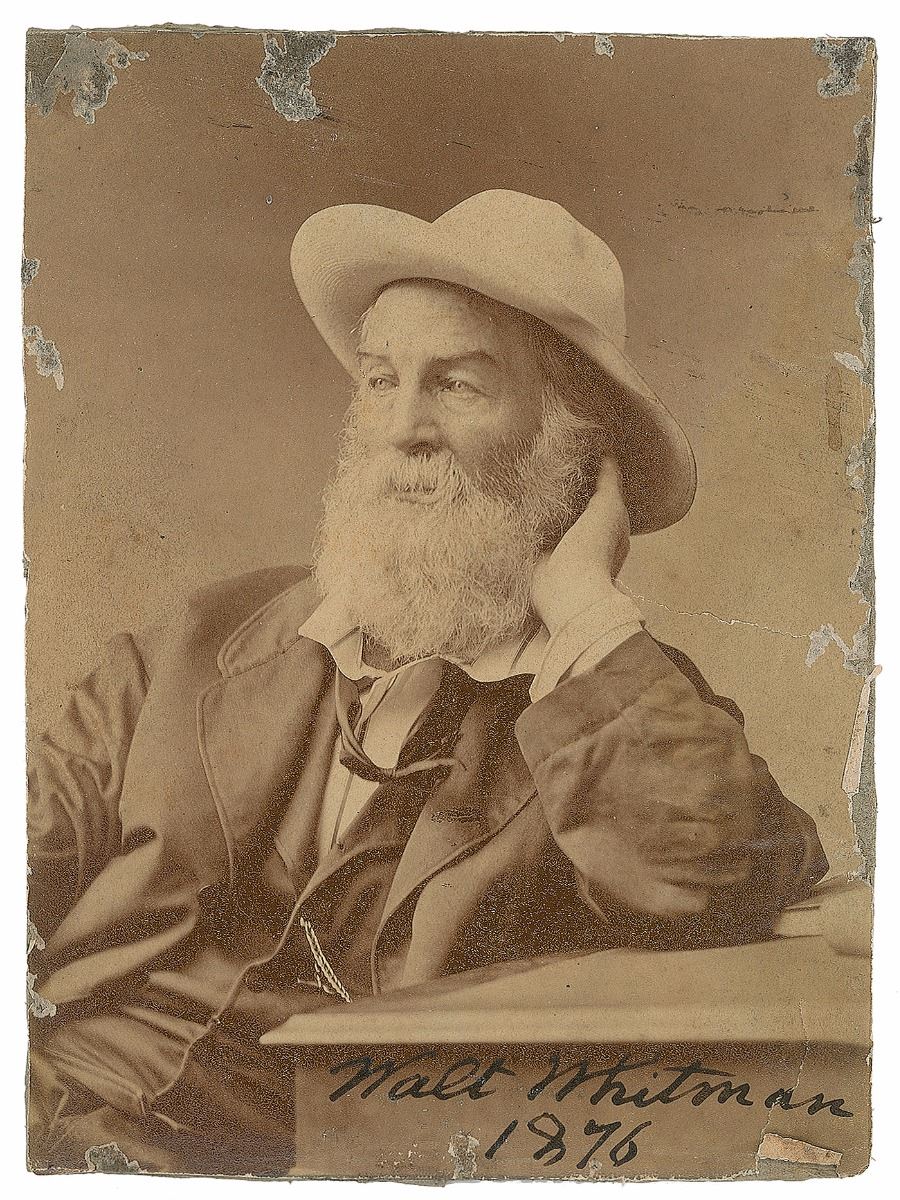 Scarce vintage 4 x 5.5 photo of Whitman resting his head in his hand, signed below in black ink, “Walt Whitman, 1876.” Mounted to a heavy piece of cardstock and in very good condition, with paper loss along edges and two tears (one passing through the end of Whitman’s last name), most of which could be matted out with some success.
