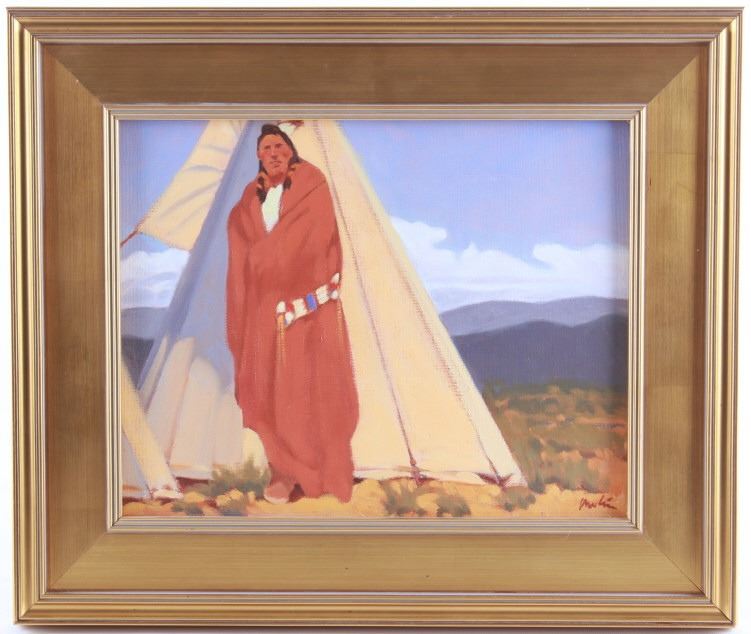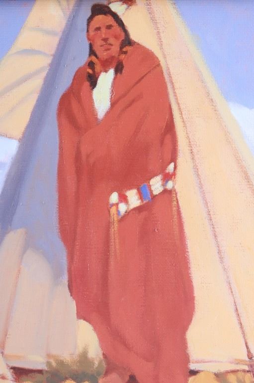Featured in this lot is this oil on canvas painting called "Teepee III," by artist Walt Wooten. The painting features a wonderfully and professionally crafted oil on canvas construction that features a Native American man wrapped in a Native trade blanket with an adornment decoration along his left side of the blanket standing in front of a teepee with the flap open on the other side of the teepee. The artist signature is seen in the bottom right hand corner of the panting. The back is marked as follows: Teepee III - copyright Walter D. Wooten. Provenance: This piece comes complete with the original gallery cards for The Squash Blossom gallery and Cogswell Gallery with purchase price of $1600. The condition of this framed oil on canvas is good with no obvious signs of damage and shows good overall condition. The measurements of this framed oil on canvas is 16 1/2" x 19 1/4" and the canvas measures 11" x 14".