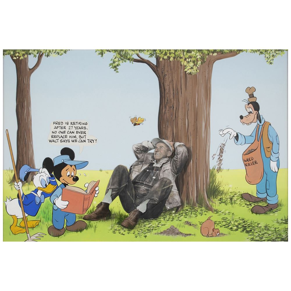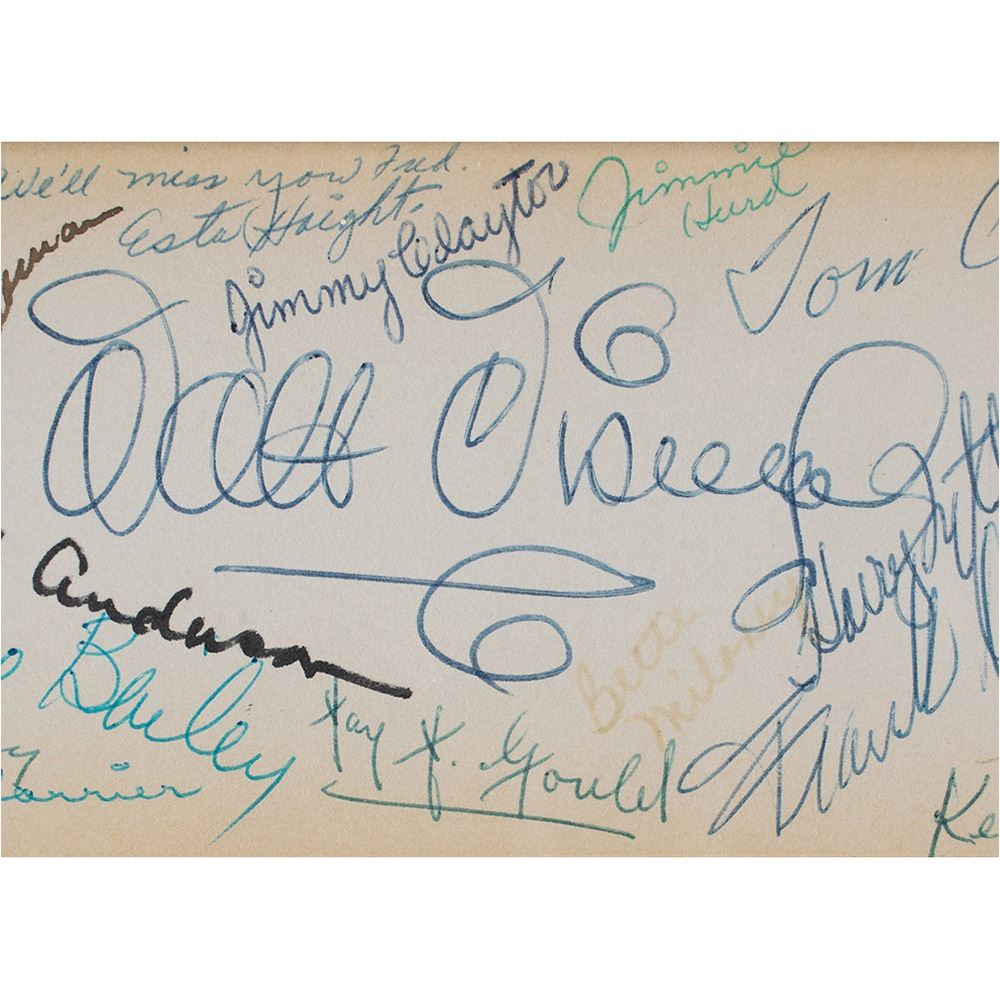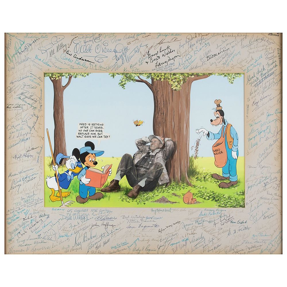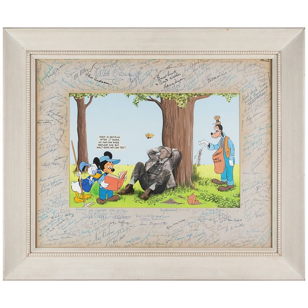 Wonderful multi-signed retirement card presented to Fred Schlatter, the longtime gardener at Walt Disney Studios, which features a trimmed photo of Schlatter placed on a hand-painted scene of Mickey Mouse, Donald Duck, and Goofy trying their hand at gardening, with Schlatter pictured relaxing at the base of a tree. A caption above Mickey reads: “Fred is retiring after 27 years. No one can ever replace him, but Walt says we can try!†The painting is matted and framed to an overall size of 24.25 x 20.5, with the mat impressively signed in ink and ballpoint by over 230 employees of Walt Disney Studios, highlighted by Walt and Roy Disney, whose can signatures are found in the upper border. A full list of signers is included and available upon request. In fine condition, with light toning to the perimeter, and fading to a handful of lesser names.