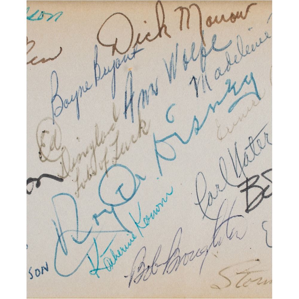 A brilliant hand-painted 'fond farewell' to a widely beloved Walt Disney Studios fixture; Schlatter's name appeared in the first issue of The Bulletin (January 6, 1939), an in-house Disney company newspaper that explained Schlatter's amazing ability to concoct gags for the Donald Duck strip. Highlighted by the uncommon presence of both Walt and Roy, this retirement card and its incredible signature total is ready-made for further research, with a quick glance turning up the names of legendary animator Ub Iwerks and influential producer Bill Anderson.