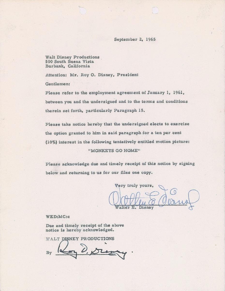 Uncommon DS, signed “Walter E. Disney” and “Roy O. Disney,” one page, 8.5 x 11, September 2, 1965. Notice concerning an antedated employment agreement, in part: “The undersigned elects to exercise the option granted to him in said paragraph for a ten per cent (10%) interest in the following tentatively entitled motion picture: ‘Monkey Go Home.’” Signed at the conclusion in blue ballpoint by Walt Disney, and countersigned in black felt tip by Roy Disney. In fine condition. Released in 1967 and starring Maurice Chevalier in his final film, Monkeys, Go Home! revolves around a young American who, after inheriting an olive farm in southern France, recruits a pack of four hyper-intelligent chimps to help with the harvest. A sought-after and seldom-seen format bearing signatures of the two Disney brothers.