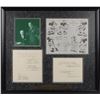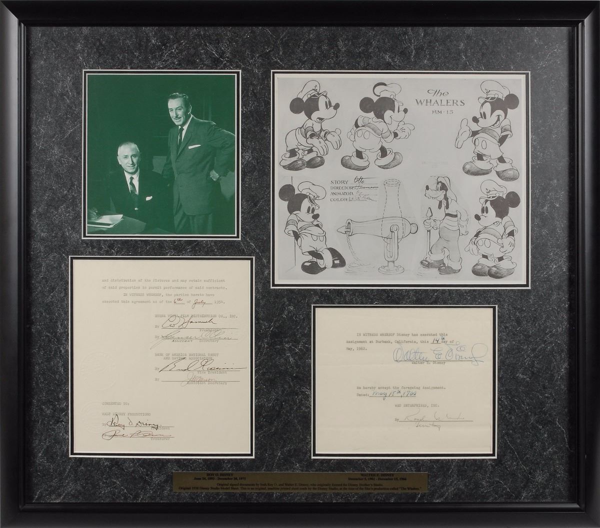 Two DSs: the first, signed at the conclusion in blue ballpoint, “Walter E. Disney,” one page, 8.25 x 6.75, May 18, 1962, consists of the final page of a contract in which Walt Disney “does hereby assign, transfer and set over unto WED Enterprises, Inc…all of Disney’s rights, title and interest in and to the following motion pictures… ‘Those Amazing Careys,’ ‘The Miracle of the White Stallion,’ and ‘Savage Sam.’” The second, signed at the conclusion in fountain pen, “Roy O. Disney,” one page, 8.25 x 9, July 6, 1954, related to a contract between Buena Vista Film Distribution and Bank of America National Trust and Savings Association. Both are double-matted and framed with an image of the famous brothers, a nameplate, and an original 1938 machine-printed Walt Disney Studio model sheet used for the production of the short film The Whalers, to an overall size of 28.5 x 25. In overall fine condition. Accompanied by three certificates of authenticity from Phil Sears, as well as the remaining document sheets for the Walt Disney-signed contract. A highly appealing display piece featuring the seldom-encountered tandem of both Disney brothers. Oversized. Please contact RR Auction for a shipping quote.