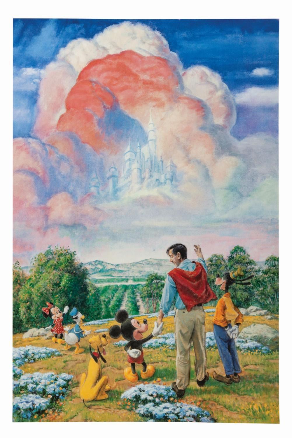 (Disneyland, c.1990s) A beautiful poster print of Charles Boyer's final composition as official master illustrator of Disneyland. Titled, Walt's Dream, the piece depicts Walt on a hill overlooking the orange groves of 1940s Anaheim, laying out his vision for a theme park to Mickey Mouse, Goofy, Pluto, Donald Duck, and Minnie Mouse as the clouds in the sky form an approximation of Sleeping Beauty Castle. Measuring 24"x16", the poster is in very good condition with only minor edge wear.