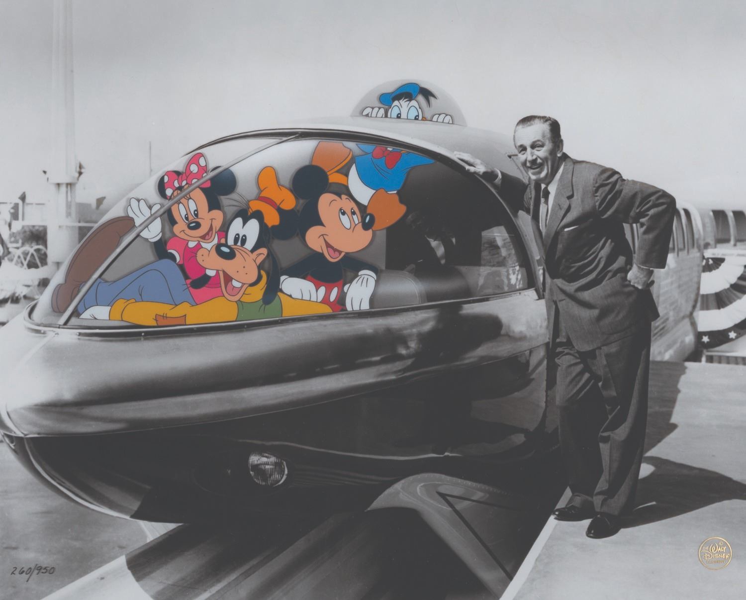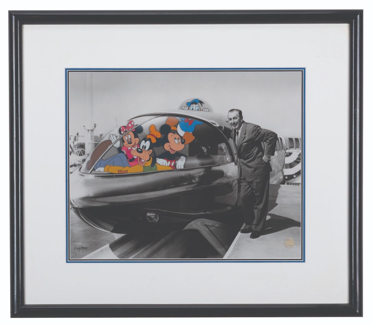 (Disney, 1995) A hand-painted cel of Mickey and Friends with a photo background of Walt and the Monorail. Titled "Walt’s Highway In The Sky", the cel was released in a limited edition of 950 to celebrate Disneyland’s 40th anniversary. Measuring 20.25" x 23.5", the piece is in fine condition with light wear to the frame from display.