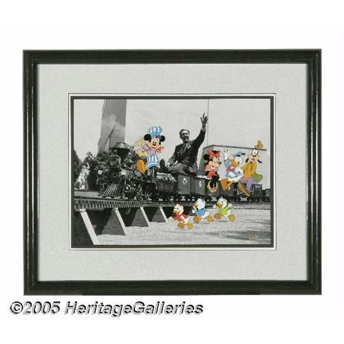 <B>Walt's Train Hand-Painted Character Cel Set-up #248/950 (The Walt Disney Company, 1993).</B></I> This is number 248 in a limited edition of 950 hand-painted character cels combined with a photograph taken in 1951 of Walt Disney on his newly-built miniature railroad at the Disney Studio in Burbank, California. This cel set-up, ""Walt's Train, "" features Walt Disney along with Mickey Mouse who assumes the role of the engineer as Minnie, Donald and Goofy join the both of them in an afternoon train ride. Original animation drawings were transferred to acetate cels by a special six-step xerographic process, which were then hand-painted. The photographic background was produced using the original black and white negative, which has been conserved at the Disney Photo Library. With an image area measuring 15.5"" x 11.5"", this cel set-up is in Excellent condition, and includes a certificate of authenticity. <BR><BR><B>Important notice:</B> Heritage usually auctions material at the rate of 200-250 lots per hour. On some occasions eBay Live bid software or the Internet may not be able to keep up with the pace of the auction. We recommend placing a realistic absentee bid now as insurance to avoid disappointment. Occasionally the auctioneer may eliminate or reject an eBay Live bid, and the auctioneer may also reopen a lot after the close of the eBay live bidding (usually because we missed an audience bid), and may reject your bid even if it shows you as the winning bidder. By bidding via eBay Live, you agree that Heritage may award the lot to another bidder at its sole discretion under the circumstances described above or any other reasonable circumstances. Since eBay bids are not shown to us until we open the lot on the floor, we treat those bids just like floor bids. In most cases the floor responds before the eBay bid is presented to us, due to Internet lag time, so for consistency we have made it a policy that floor bids are always considered first over tie eBay live bi