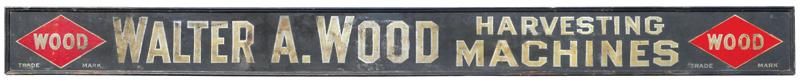 Walter A. Wood Harvesting Machines primitive wooden sign, c.1890, VG orig cond, 12.25"H x 143"W.