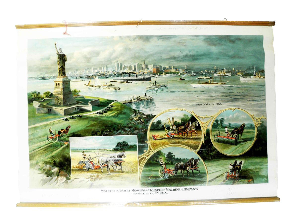 Walter A. Wood Mowing and Reaping Machine Company Paper Banner. Hoosick Falls, New York. Rare 1900 image of New York and its harbor. This is the only one we have ever seen. A Premium piece of work by the American Lithograph Company NY. Some pencil writing top and bottom margin, small tear at 12:00, some light edge ware otherwise very good condition. 42 X 29 1/2 inches.
