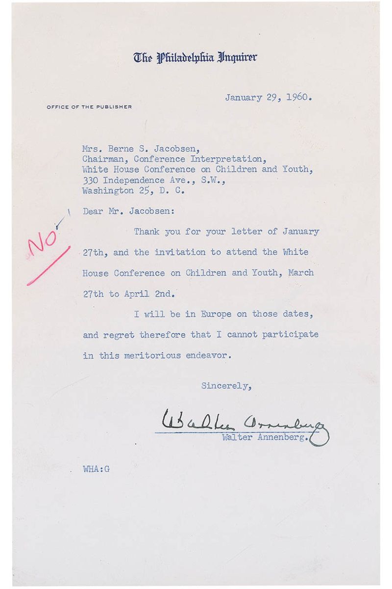 Billionaire publisher and philanthropist (1908–2002). TLS, one page, 6 x 9.5, Philadelphia Inquirer letterhead, January 29, 1960. Letter to Berne S. Jacobsen. In full: “Thank you for your letter of January 27th, and the invitation to attend the White House Conference on Children and Youth, March 2nd to April 2nd. I will be in Europe on those dates, and regret therefore that I cannot participate in this meritorious endeavor.” In fine condition, with scattered creases and a red ink “no” notation to the left side.