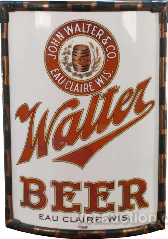 Walter Beer Curved Vitrolite Corner Sign In Original Copper Flash Frame, Eau Claire, WIS. - 22" x 17" x 4"