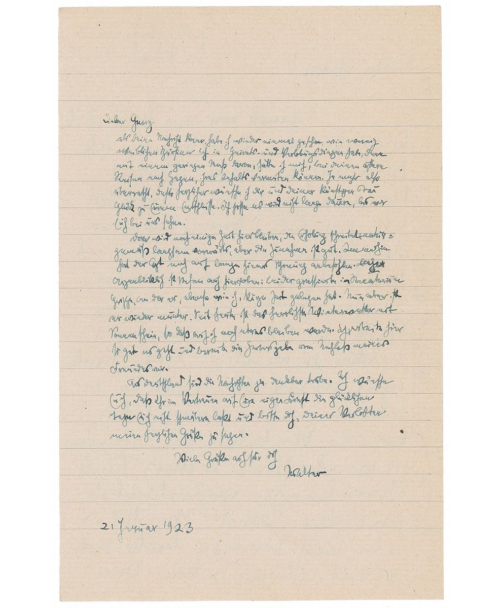 German philosopher and cultural critic (1892–1940) who made enduring and influential contributions to aesthetic theory and Western Marxism. Substantial archive of Benjamin family correspondence, comprising eighteen letters totaling thirty-nine pages, including one ALS by Walter Benjamin, eight ALSs by Georg Benjamin, three ALSs by Georg’s fiancee Grete Kliem, and six ALSs by her friend Lisabeth. Most important is the ALS in German by Walter Benjamin, signed “Walter,” one page, 4.5 x 7, January 21, 1923. In full (translated): "When your message arrived I once more noticed how undeveloped is my female intuition as to matters of marriage and engagement, for had I possessed only a minor quantity I might well have guessed at the reason for your frequent trips to Hagen. The more surprised I am, the more cordially I wish you and your future wife every happiness with your decision. I hope it will not be long before we see the both of you at our place.
